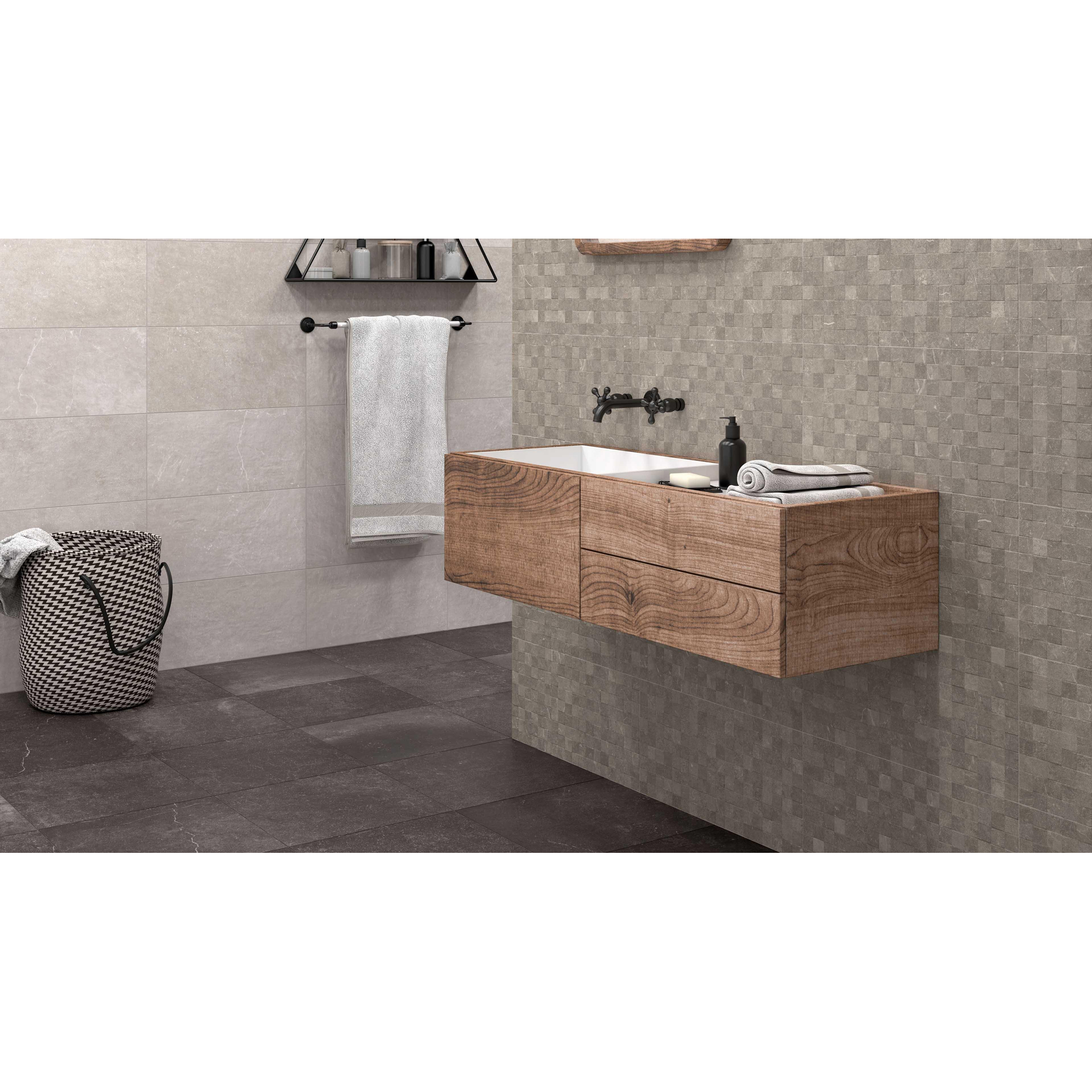 - Couleur coal profonde dans un aspect pierre naturelle noir mat, parfaite pour les salles de bains modernes