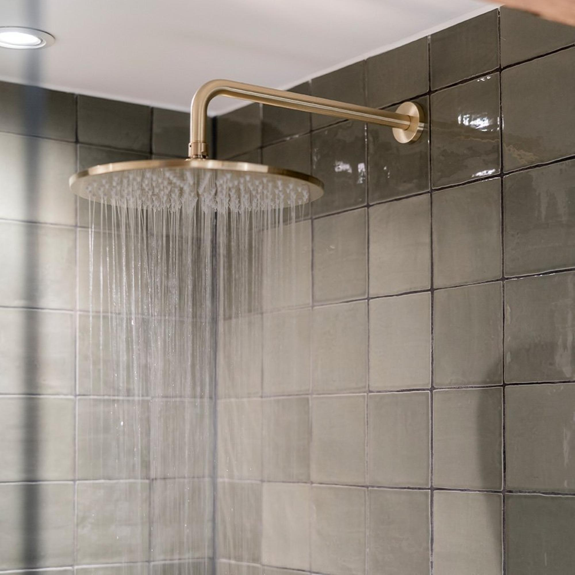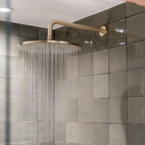 Cet ensemble de douche encastré Crosswater MPRO doré se compose d'une pomme de douche de pas moins de 30 centimètres qui se fixe au mur, d'un thermostat et d'une douchette à main séparée. Le thermostat est placé verticalement et dispose de deux boutons: celui du haut permet de passer de la douche à main à la douche principale (2 voies), celui du bas de régler la bonne température. Cet ensemble peut aussi varier en composition : avec douche fixée au plafond, barre mortier jointuresante fixe et douchette à main ou douche de tête de 20 centimètres. Le noir mat et le chrome font partie des possibilités en terme de finition.