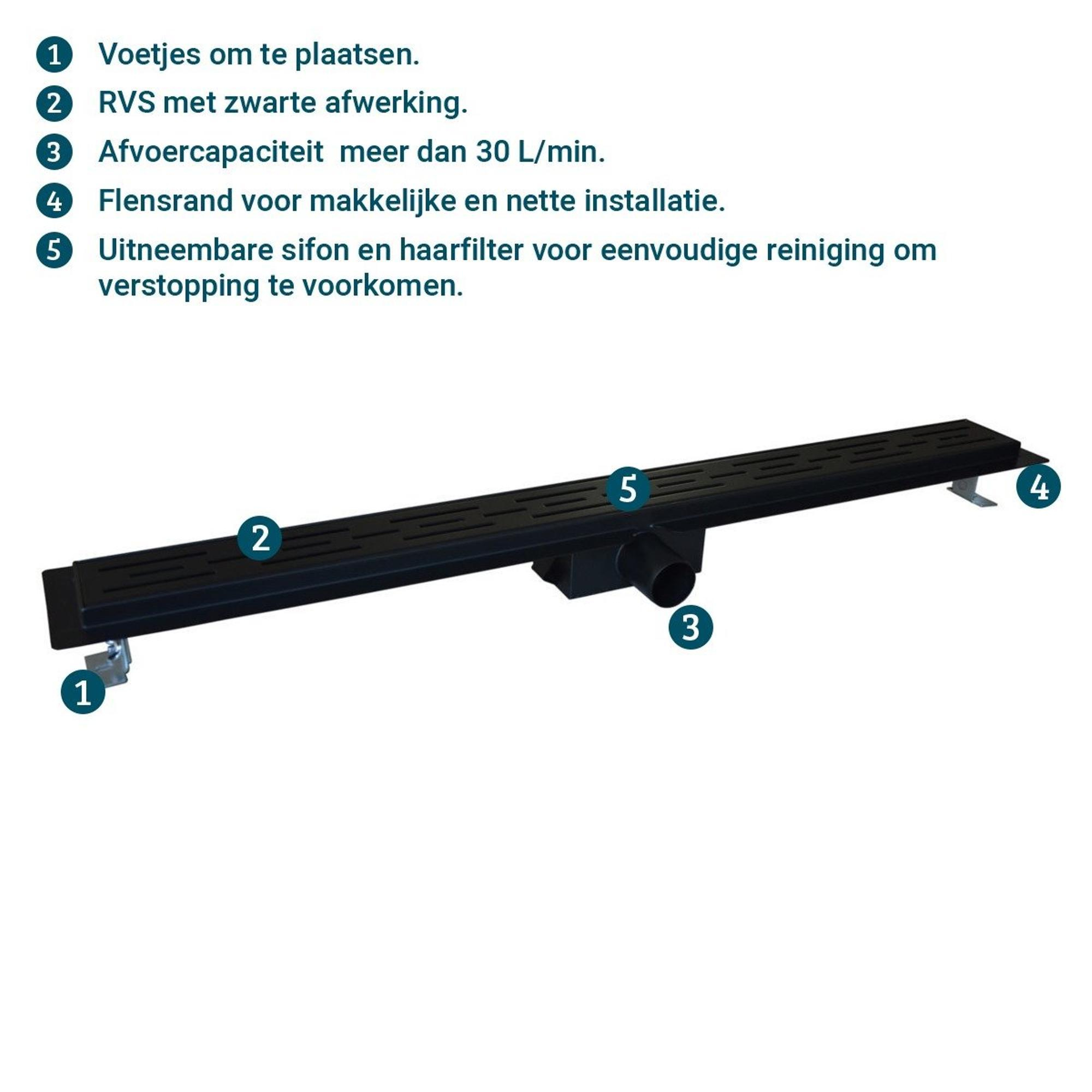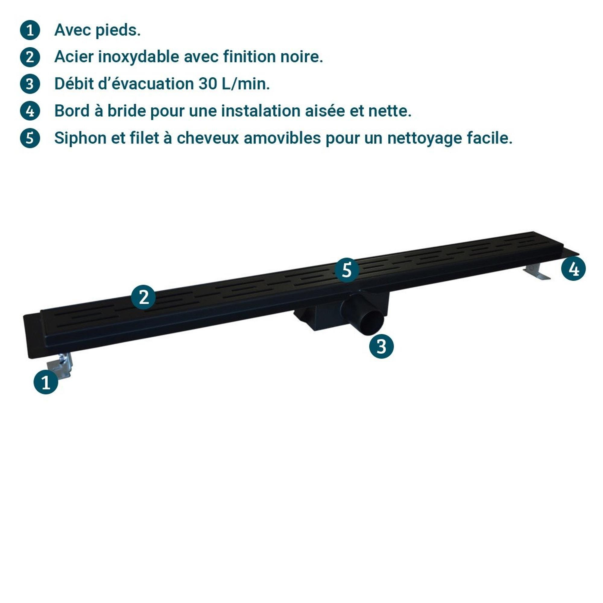 Wiesbaden Caniveau de douche avec bride et grille 70 x 7 cm noir mat