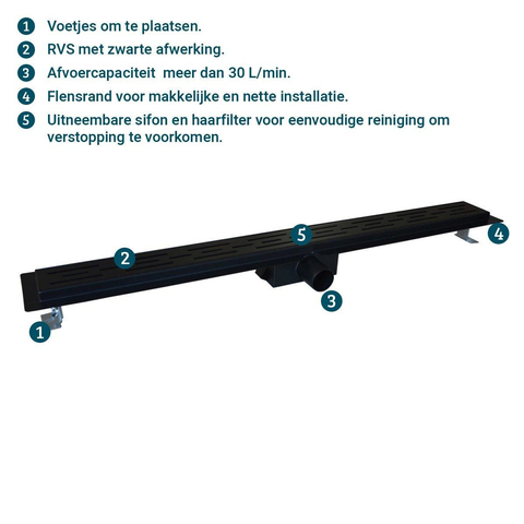 Ce caniveau de douche élégant est un choix intelligent pour ceux qui recherchent une solution d'évacuation épurée et fonctionnelle dans la salle de bains. Grâce à ses dimensions fines de 70 x 7 cm, ce caniveau s'intègre parfaitement dans des douches modernes et minimalistes où espace et design vont de pair. La finition noire mate offre un aspect contemporain qui s'harmonise bien avec divers styles de carrelage et de sanitaires. Ce produit est idéal pour les salles de bains où vous souhaitez réaliser une finition étanche et sans joint, par exemple dans une douche à l'italienne avec un sol carrelé que vous voulez faire courir de manière uniforme. Notez toutefois que le revêtement noir est sensible aux rayures| Numéro d'article | SW258675 | |