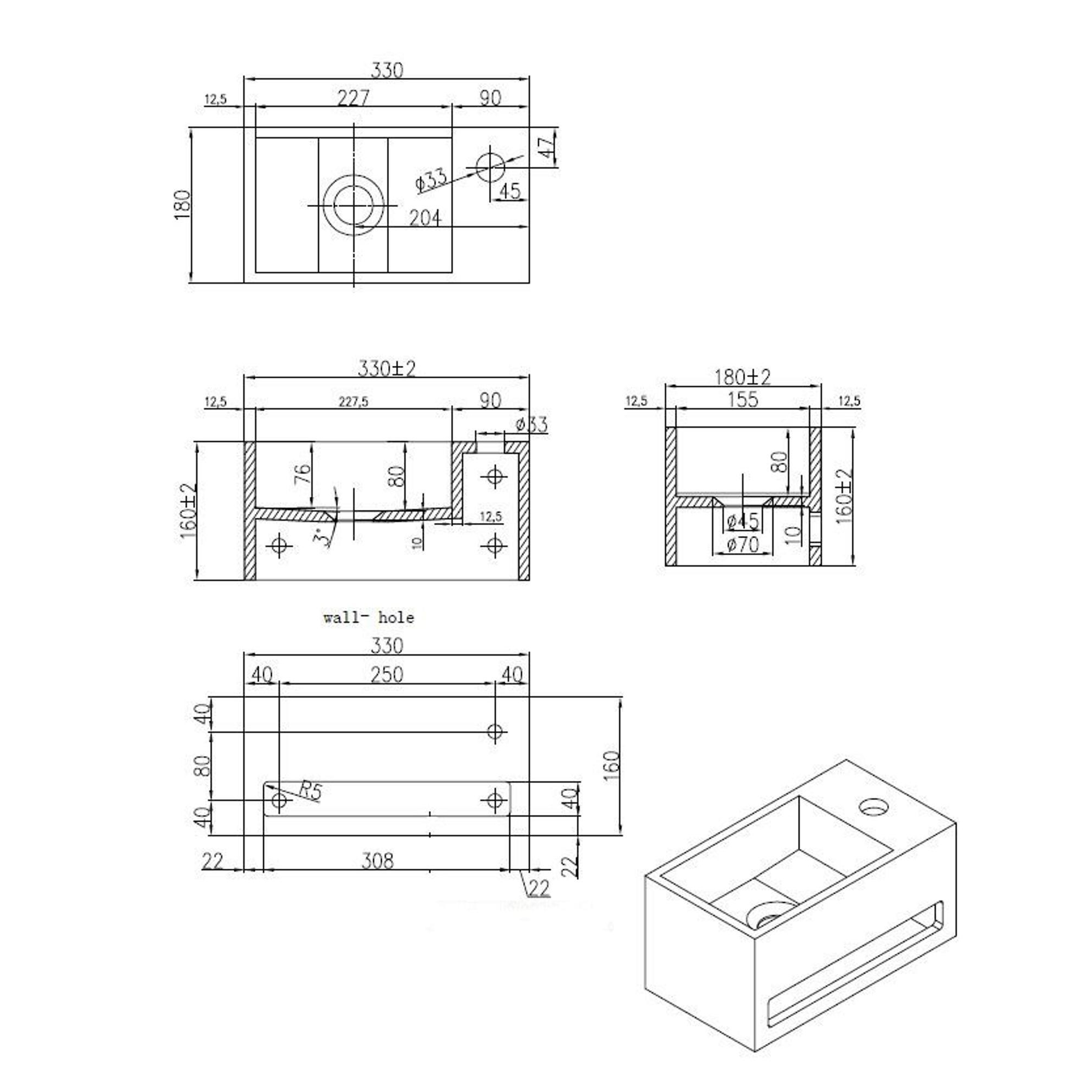 - Lavabo compact de 33x18x16 cm, idéal pour les petites toilettes et les salles de bains étroites