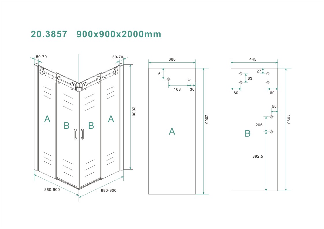 - Dimensions 900 x 900 x 2000 mm, adaptée aux petites salles de bains