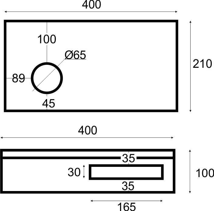 - Découpe placée à gauche, adaptée pour lavabo posé de 20 cm de large