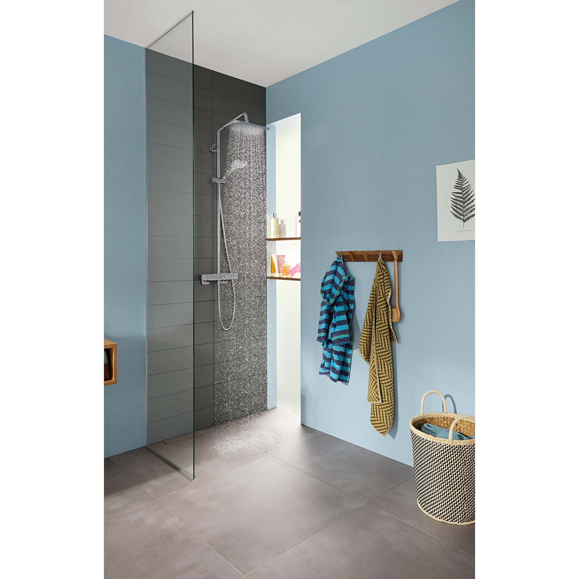 Entrez sous la douche et ressentez immédiatement la sensation de luxe et de confort que ce système de douche complet vous offre. Avec un design épuré et moderne, il élève votre salle de bains à un niveau supérieur, tandis que la facilité d'utilisation pratique rend votre routine quotidienne sans effort. La combinaison d'une pomme de tête généreuse et d'une douchette polyvalente assure un jet d'eau agréable qui vous enveloppe complètement. Grâce au thermostat fiable, vous profitez toujours de la température parfaite, sans fluctuations. Ce système n'est pas seulement un plaisir pour vous-même, mais aussi sûr et agréable pour toute la famille. Le chrome de haute qualité offre une finition brillante facile à nettoyer, pour que votre salle de bains soit toujours soignée. Ainsi, la douche devient un moment de détente et de plaisir, jour après jour.