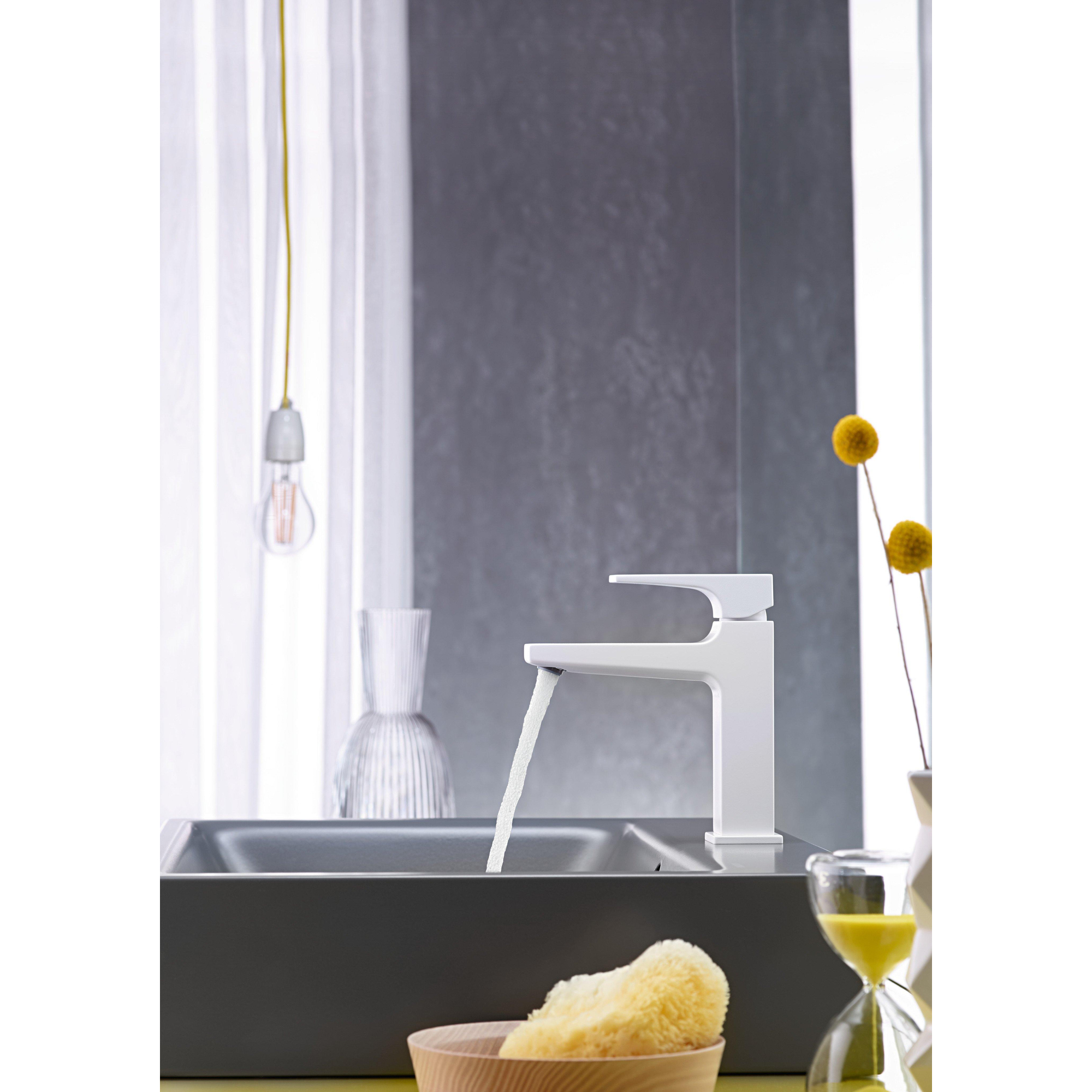 Ce robinet se distingue immédiatement par son design élégant et minimaliste aux lignes épurées et à la finition blanche mate qui s'intègre parfaitement dans une salle de bains moderne. Le design géométrique confère une apparence calme et raffinée, ce qui en fait une déclaration subtile mais puissante. Le vidage PushOpen sans levier visible contribue à l'aspect épuré et assure un ensemble ordonné. Vous profitez ainsi non seulement d'un robinet fonctionnel, mais aussi d'un élément décoratif élégant qui donne à votre salle de bains une allure luxueuse.