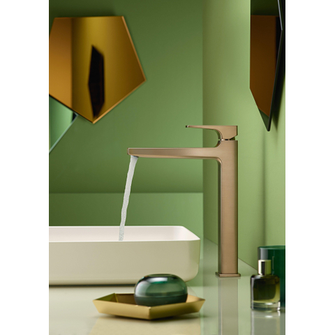 Ce mitigeur est une véritable déclaration de design. Les lignes claires et la couleur bronze chaude assurent un aspect intemporel et pourtant moderne. La finition brossée donne un éclat subtil sans dominer, ce qui permet au robinet de s'intégrer parfaitement dans divers styles de salle de bains. Grâce aux surfaces spacieuses et à la forme géométrique, votre lavabo obtient un look raffiné et exclusif qui invite à l'admiration. Ainsi, vous ajoutez une touche de luxe à votre routine quotidienne.