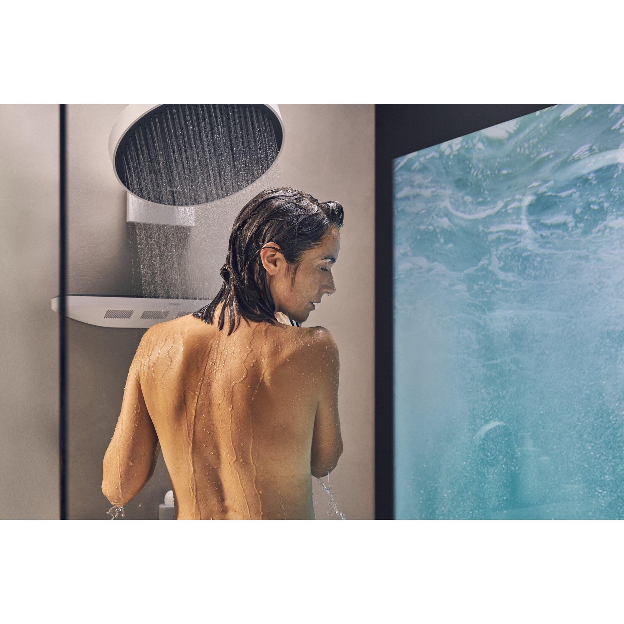 - Finition mat blanc avec plaque de jets métallique anthracite pour un design élégant