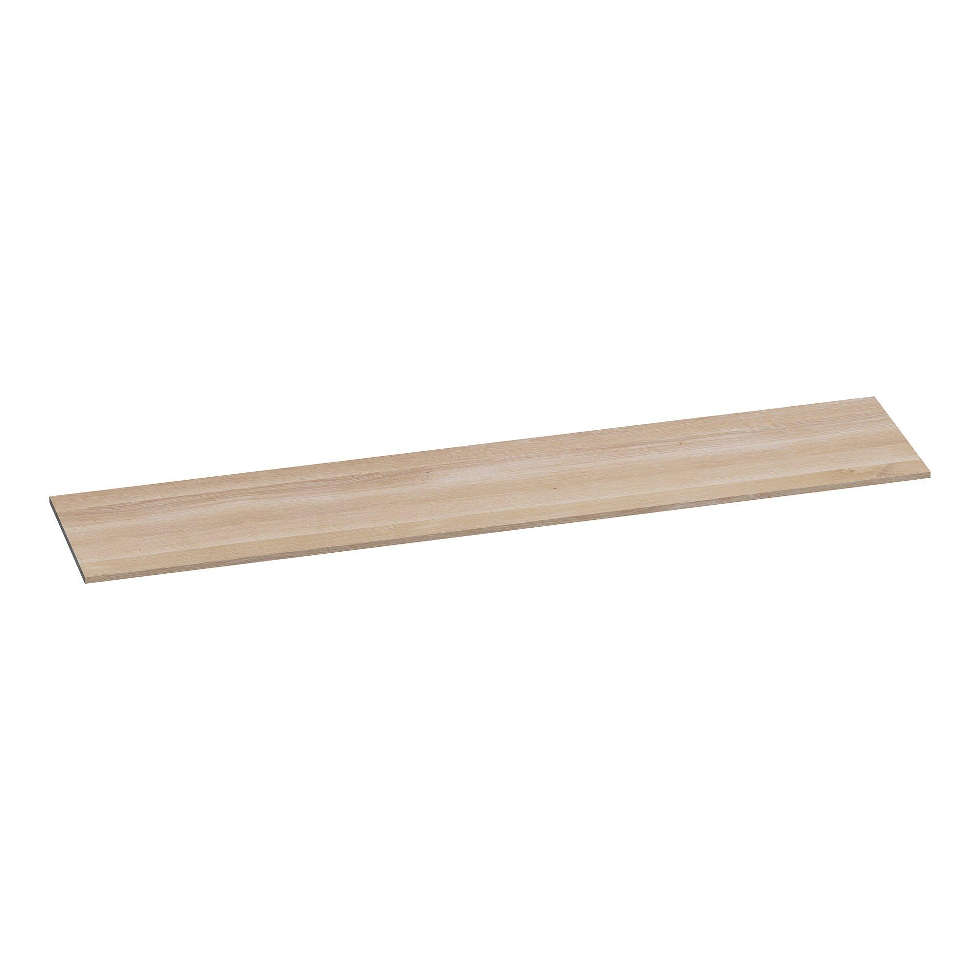 Le plan est fabriqué en chêne massif avec des lattes continues, ce qui assure une base robuste et solide. Ce matériau offre une sensation de solidité et, avec un entretien approprié, résiste très bien à une utilisation quotidienne dans la salle de bains. Le bois accompagne naturellement les variations de température et d’humidité, de sorte qu’un plan massif de qualité constitue une solution durable si vous le traitez correctement et l’entretenez régulièrement. Combinez-le avec des consoles ou des supports muraux adaptés pour un montage suspendu en toute sécurité et vous profiterez d’un effet épuré et flottant sans rien sacrifier à la stabilité. Avec la bonne finition et une huile d’entretien, la couleur du chêne blanc reste belle pendant longtemps et le plan demeure un élément central plein d’ambiance dans votre salle de bains.
