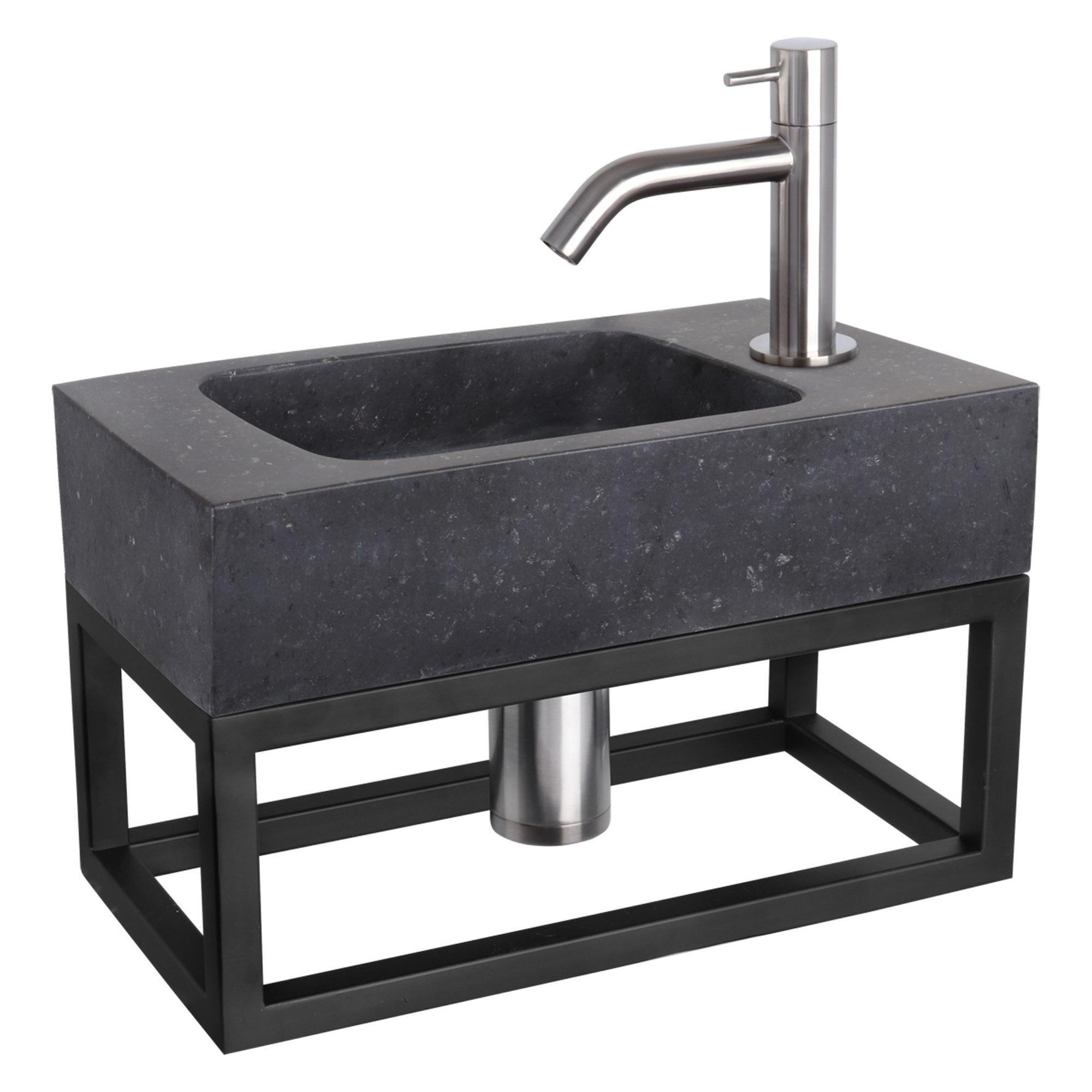 Differnz Bombai Kit lave-mains - 40x22x9cm - Droit - 1 trou de robinet - Robinet chromé mat courbé - avec cadre noir - Pierre naturelle noire