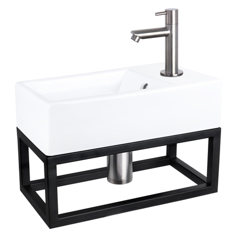 Differnz Force Kit lave-mains - 40x22x11.5cm - Rectangulaire - 1 trou de robinet - Robinet droit en chrome mat - avec cadre noir - Céramique Blanc
