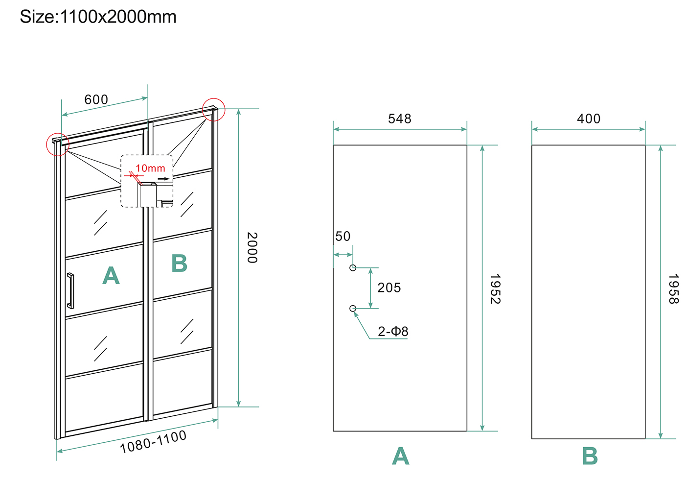 - Dimensions : 1100 x 2000 mm (porte 60 cm, partie fixe 50 cm)