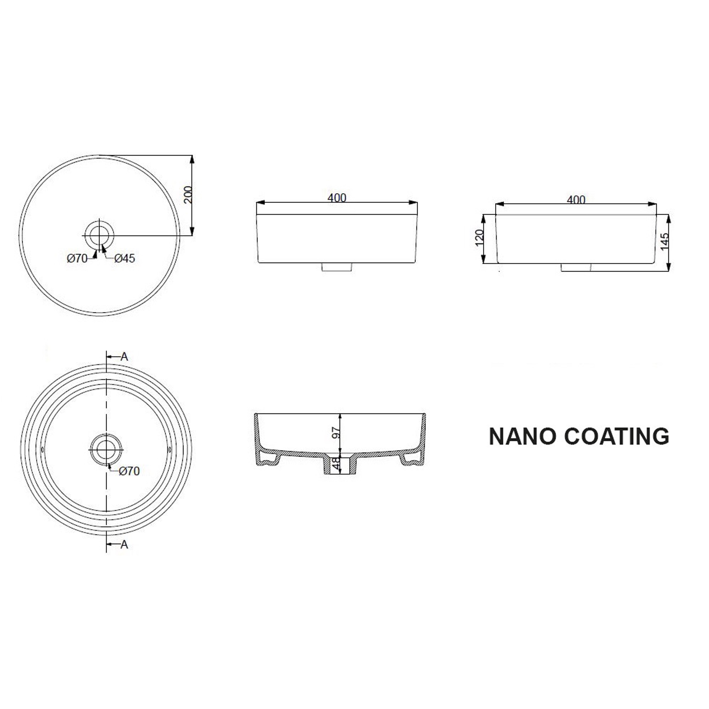 - Vasque ronde avec un diamètre de 40 cm et une hauteur de 14,5 cm – parfaitement adaptée à divers meubles lavabo