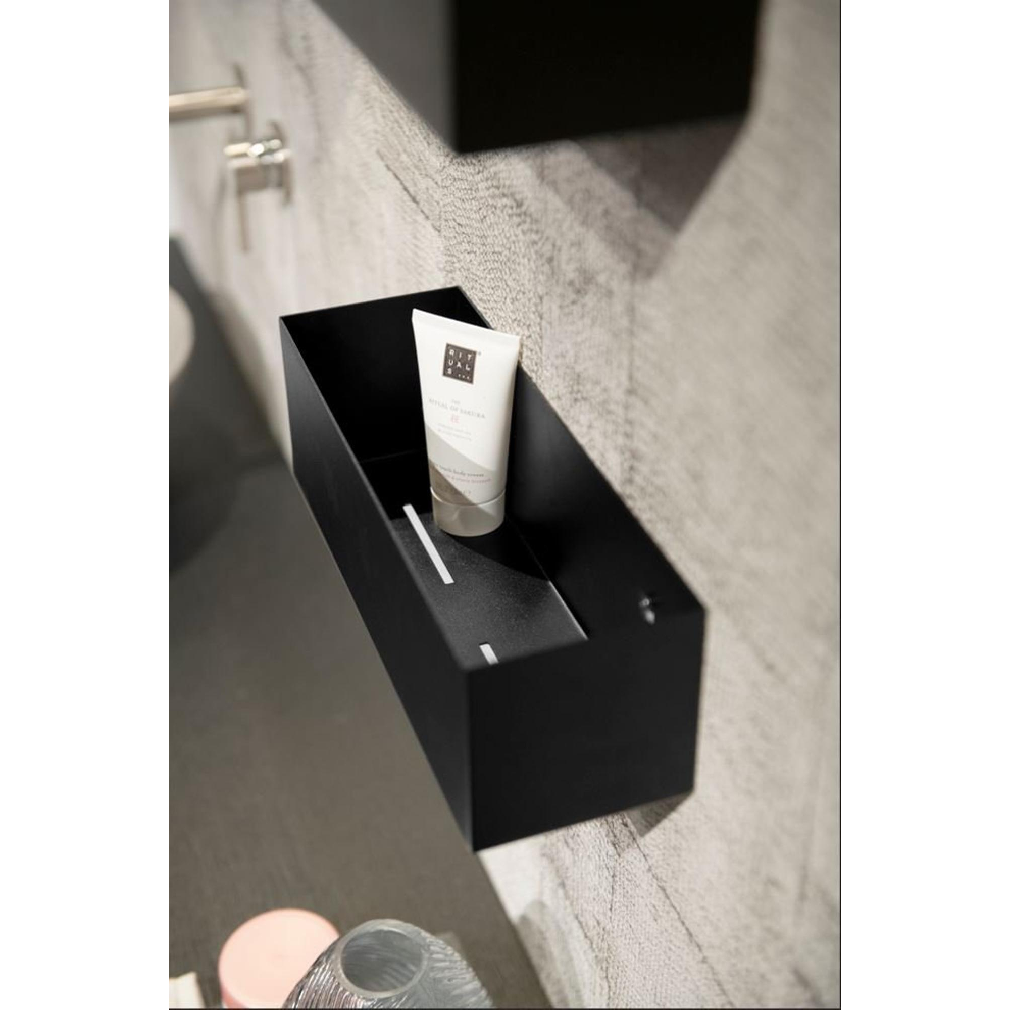 La forme minimaliste et la couleur anthracite profonde confèrent à cette boîte de rangement une apparence haut de gamme, presque architecturale. Comme la boîte semble constituée d’une seule ligne nette, elle reste discrète contre le mur et met en valeur le carrelage ou le revêtement mural au lieu d’entrer en concurrence avec eux. L’anthracite est en outre une couleur intemporelle qui s’accorde aussi bien avec les robinets noirs qu’avec les finitions inox et chrome, ce qui vous permet de créer facilement un ensemble harmonieux. Utilisez-la par exemple comme alternative épurée à une niche dans la douche, ou comme étagère décorative pour de jolis flacons et accessoires dans la zone meuble de salle de bains. Vous ajoutez ainsi non seulement un espace de rangement supplémentaire, mais vous élevez aussi le look complet de votre salle de bains à un niveau supérieur.