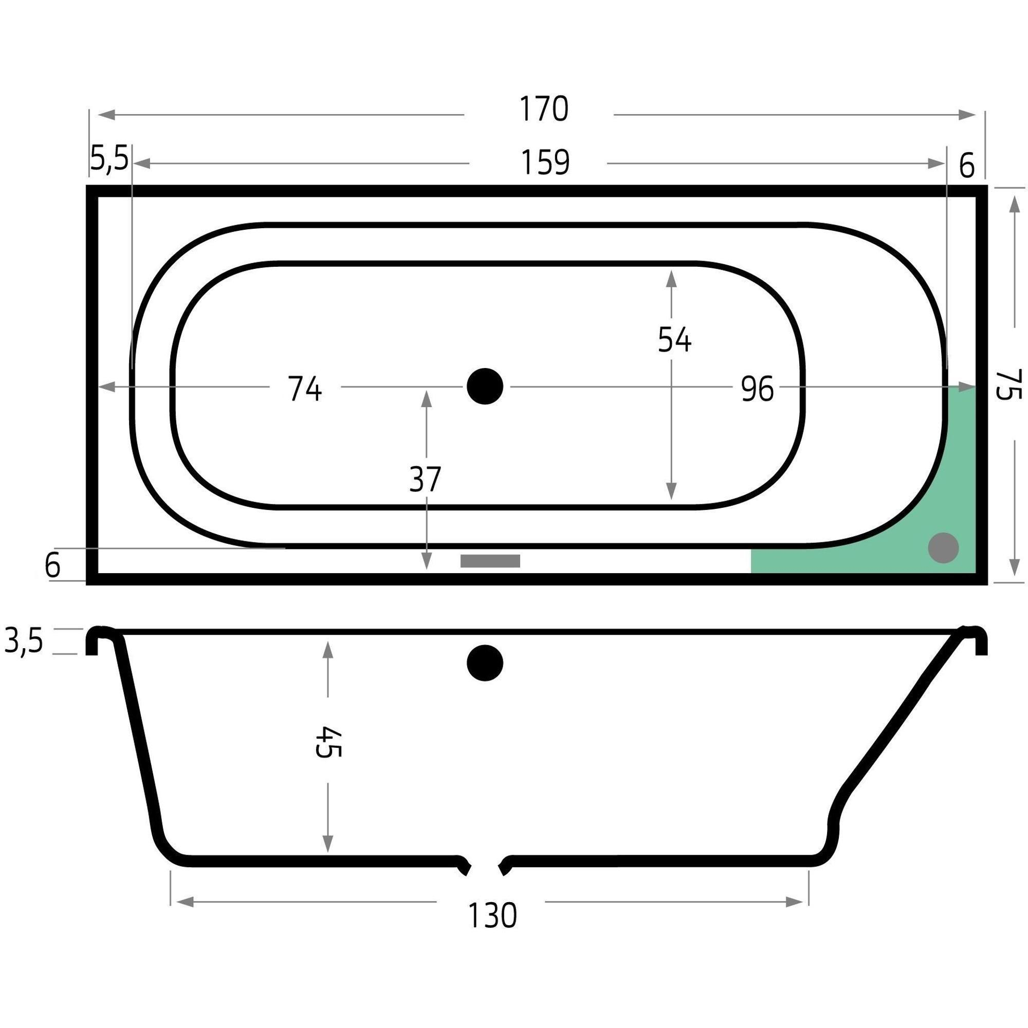 Les dimensions 170x75x48 cm ont été soigneusement choisies pour combiner un confort de couchage agréable avec une dimension d’encastrement pratique. Avec un fond d’environ 130x54 cm et une profondeur d’environ 45 cm, cette baignoire offre suffisamment de longueur et de profondeur pour se détendre confortablement sans que vos épaules ne dépassent du bord. La forme rectangulaire assure une position assise et allongée stable, ce qui est appréciable si vous prenez régulièrement une douche dans la baignoire. La bonde au milieu évite de s’asseoir sur la bonde d’évacuation et rend la baignoire également adaptée comme baignoire duo, afin que vous puissiez profiter confortablement à deux. C’est justement dans les salles de bains petites ou moyennes que cet équilibre est idéal : suffisamment grande pour vraiment se détendre, mais assez compacte pour conserver encore beaucoup d’espace de circulation autour.