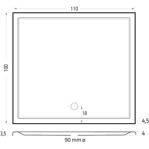 - Receveur de douche rectangulaire spacieux de 110x100 cm pour une plus grande liberté de mouvement sous la douche.