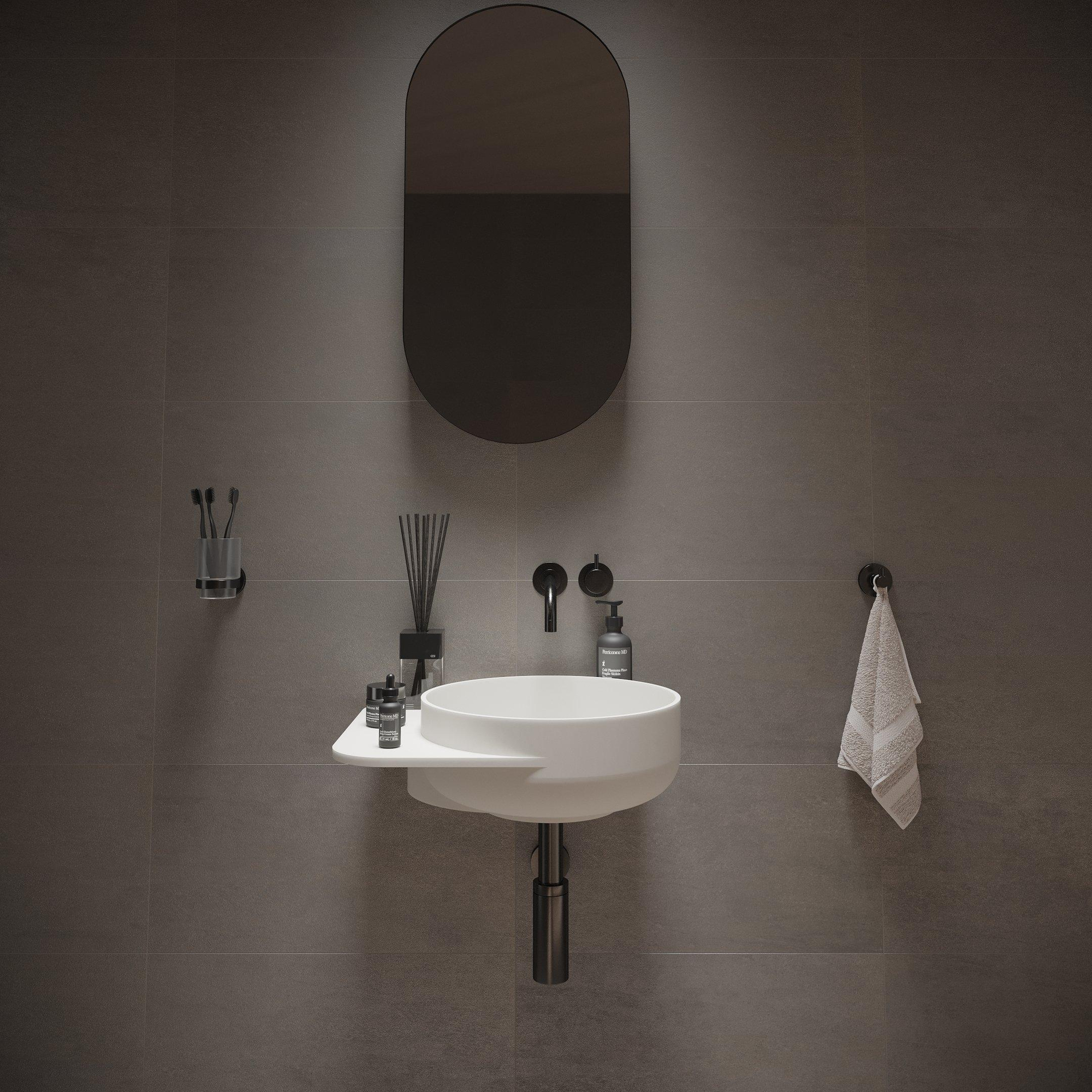 Comme ce modèle est conçu pour un montage en pose libre, vous pouvez facilement l’installer sur un plan ou un meuble de votre choix. Cela vous laisse une grande liberté en termes de hauteur, de position et de style : combinez-le avec un plan en bois pour une ambiance chaleureuse et naturelle, ou avec un plan blanc ou noir épuré pour un ensemble minimaliste. L’absence de trous de robinet signifie que vous n’êtes pas lié à un seul type de configuration et pouvez décider vous-même d’installer un mitigeur de lavabo sur plan ou un robinet mural. Grâce à la dimension d’évacuation standard, vous raccordez facilement la cuve à un siphon et un clapet de vidage assortis. Vous composez ainsi pas à pas votre point d’eau idéal, parfaitement adapté à votre utilisation et à vos goûts.