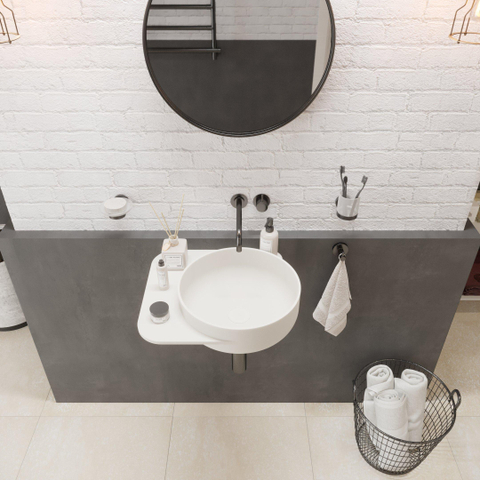 Avec des dimensions de 49x43x15,5 cm, ce lavabo offre un bon équilibre entre confort et gain de place. La cuve est suffisamment généreuse pour un usage quotidien, mais occupe visuellement peu d’espace sur votre plan, ce qui donne à votre salle de bains une impression de grandeur et de sérénité. Les formes arrondies créent une apparence douce et accueillante qui se marie aussi bien avec des meubles aux lignes droites qu’avec des miroirs et accessoires ronds. Comme aucun trou pour robinet n’est pré-percé, vous êtes libre d’opter pour un mitigeur posé sur le plan ou un robinet encastré dans le mur, ce qui renforce encore la pureté des lignes. Vous créez ainsi facilement un look haut de gamme digne d’un hôtel, même dans un petit espace.