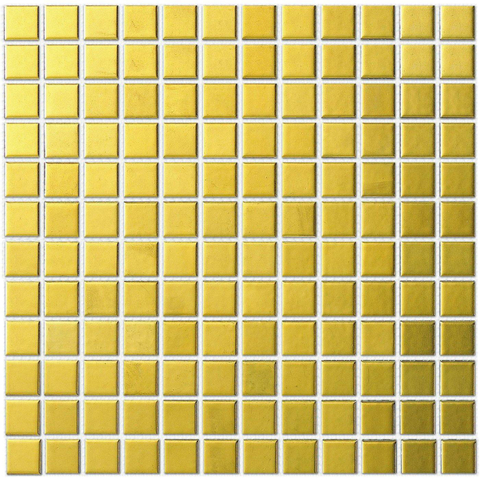 Ce carreau de mosaïque a une taille de 30x30cm (taille du carreau). La finition de la tuile est brillante et émaillée. Les carreaux de mosaïque sur le carreau font 2,3x2,3x0,6cm et ont un joint de 2,5mm. La couleur de cette tuile est un or métallique brillant.