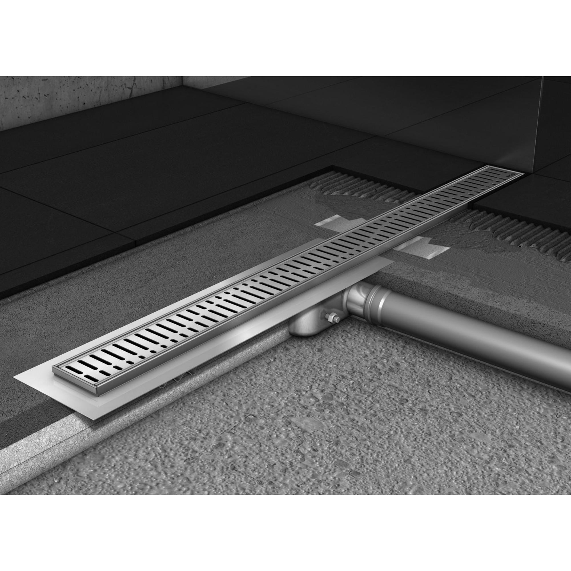 - Caniveau de douche fin d’env. 1185 mm de long et 70 mm de large pour un sol de douche moderne et épuré