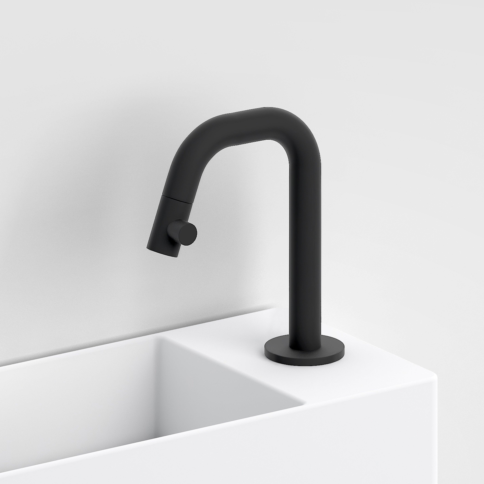 Le design ultra-fin avec un diamètre extérieur d’environ 20 mm seulement confère à ce robinet un look minimaliste, presque architectural. C’est précisément parce que la forme est si épurée et calme que la couleur noire mate ressort particulièrement bien et crée une atmosphère luxueuse, digne d’un hôtel, dans vos toilettes. Le bec court est idéal pour les lave-mains compacts : il y a suffisamment d’espace pour se laver les mains, sans que le robinet ne dépasse trop vers l’avant ou ne gêne. Associez-le à un lave-mains rond ou rectangulaire et à des accessoires noirs assortis pour un ensemble harmonieux.