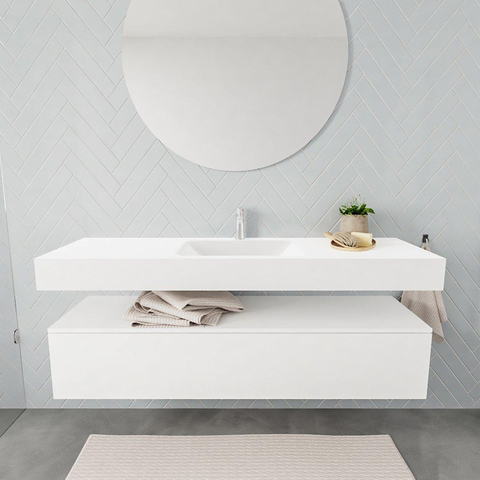 MONDIAZ ALAN 150cm - meuble bas - 1 tiroir - lavabo suspendu - vasque au milieu - 1 trou de robinet - talc