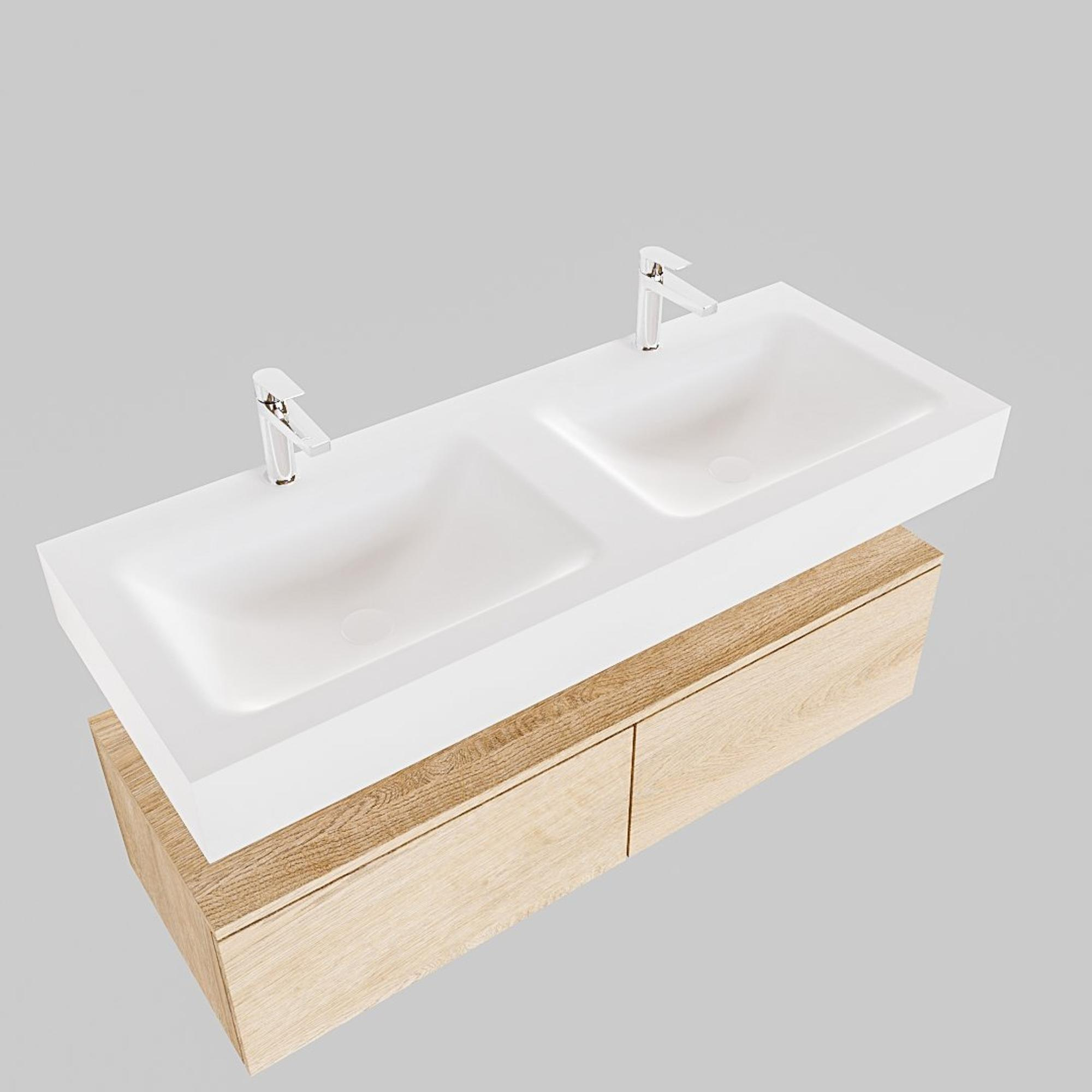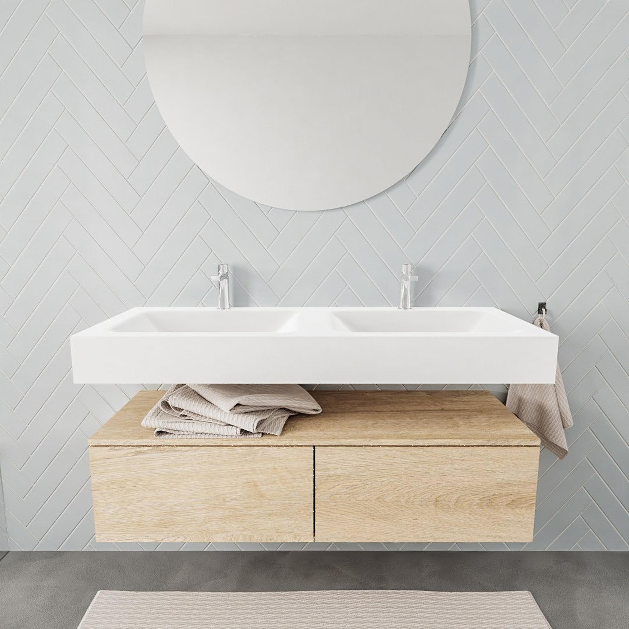 MONDIAZ ALAN 120cm - meuble bas - chêne délavé - 2 tiroirs - lavabo suspendu - 2 vasques - 2 trous de robinetterie - talc