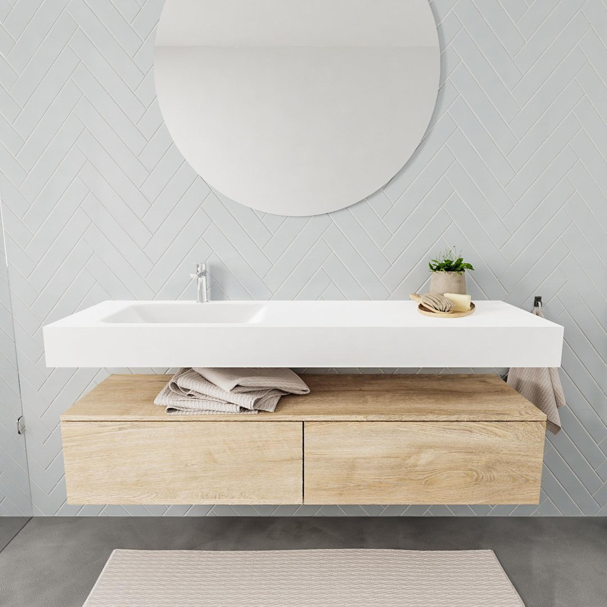 MONDIAZ ALAN 150cm - meuble bas - chêne vieilli - 2 tiroirs - lavabo suspendu - vasque à gauche - 1 trou de robinet - talc