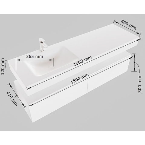 Avec 2 tiroirs, le meuble bas MONDIAZ ALAN 150cm offre suffisamment d’espace de rangement pour toutes vos affaires de salle de bains. Le lavabo suspendu et la vasque à gauche permettent une utilisation efficace de l’espace, ce qui permet à votre salle de bains de rester bien rangée et organisée. Le trou de robinet et la finition talc ajoutent un aspect pratique à ce meuble élégant.