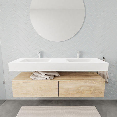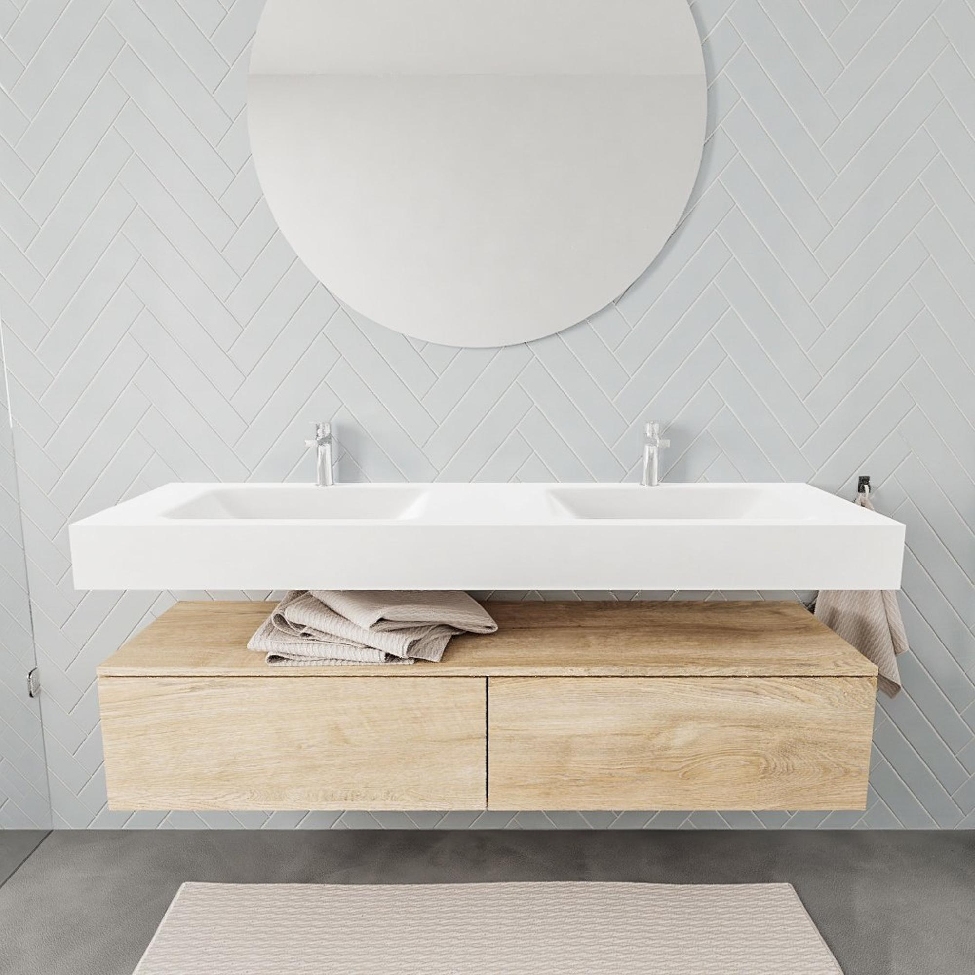 MONDIAZ ALAN 150cm - meuble sous-vasque - chêne blanchi - 2 tiroirs - lavabo suspendu - 2 bassins - 2 trous de robinet - talc