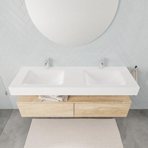 Avec 2 grands tiroirs, ce meuble sous-vasque offre suffisamment d’espace de rangement pour toutes vos affaires de salle de bains. Les 2 bassins et les trous de robinet permettent de partager le lavabo, ce qui le rend idéal pour les matinées chargées. L’agencement pratique et les matériaux de haute qualité garantissent un meuble fonctionnel à la fois beau et pratique.
