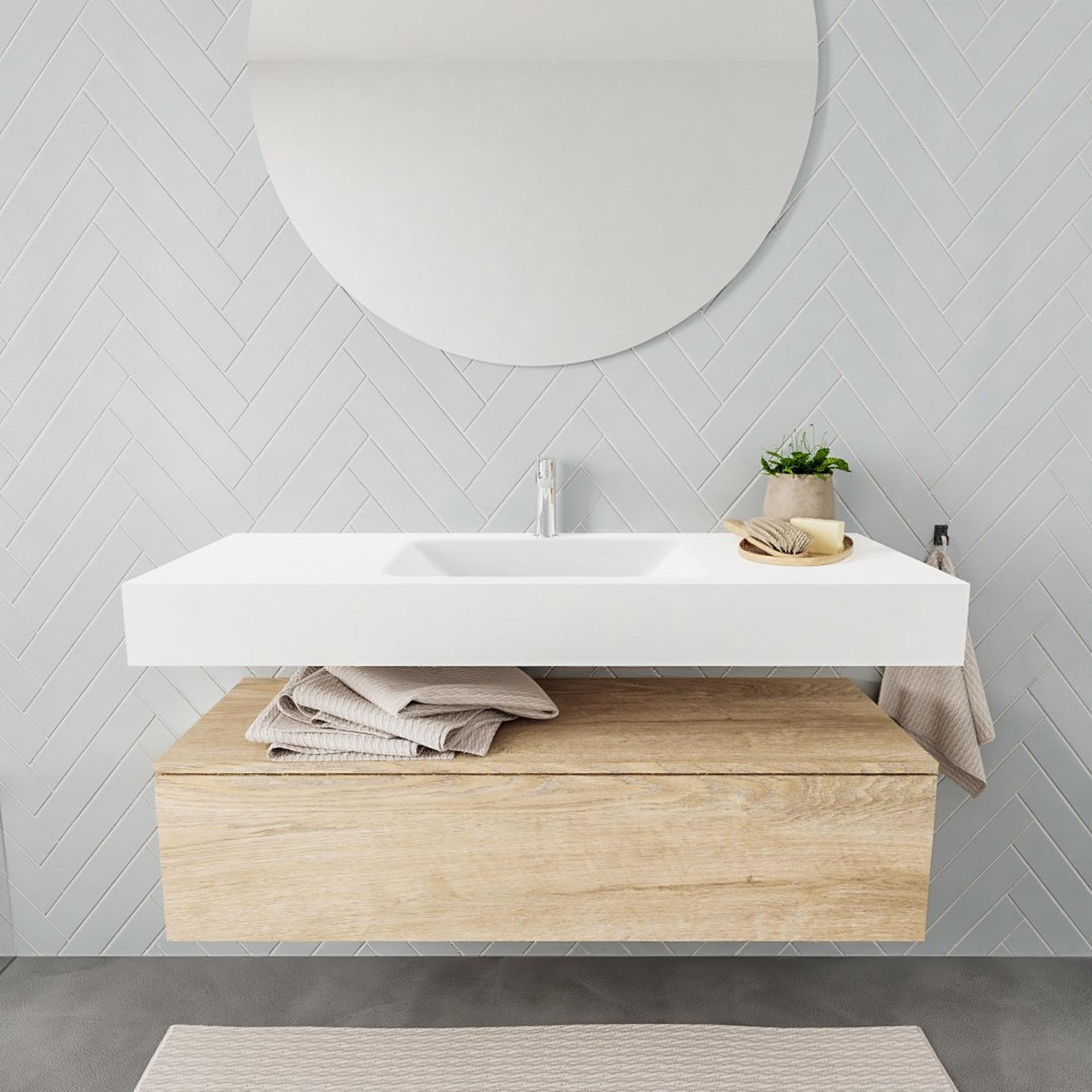 MONDIAZ ALAN 120cm - meuble bas - chêne blanchi - 1 tiroir - lavabo suspendu - cuve au milieu - 1 trou de robinet - talc