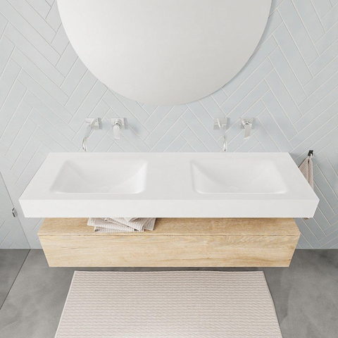 MONDIAZ ALAN 150cm - meuble bas - chêne lavé - 1 tiroir - lavabo suspendu - 2 bassins - 0 trous de robinetterie - talc