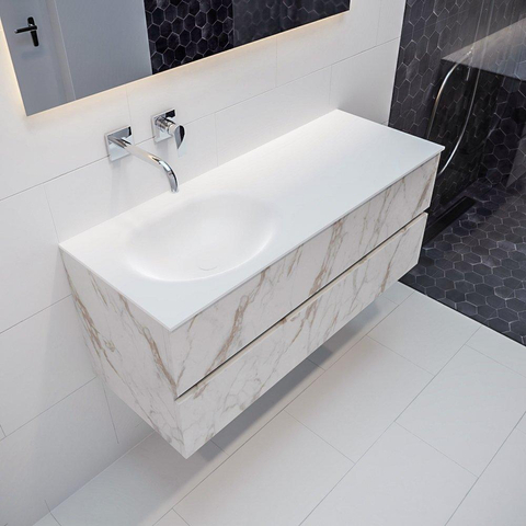 MONDIAZ VICA Ensemble de meuble salle de bain - 120cm - 2 tiroirs - lavabo Moon gauche - 0 trous de robinet - solid surface marbre carrara