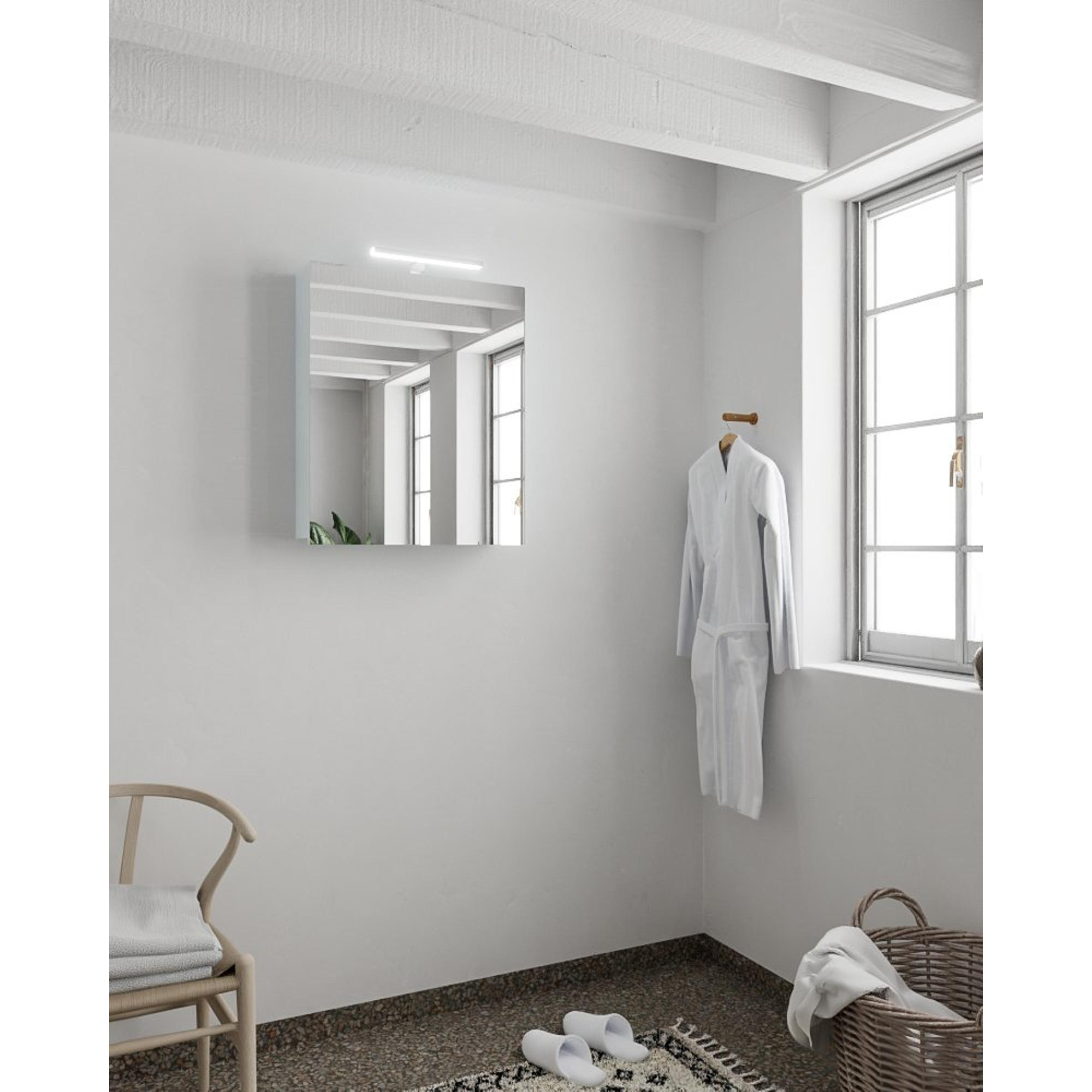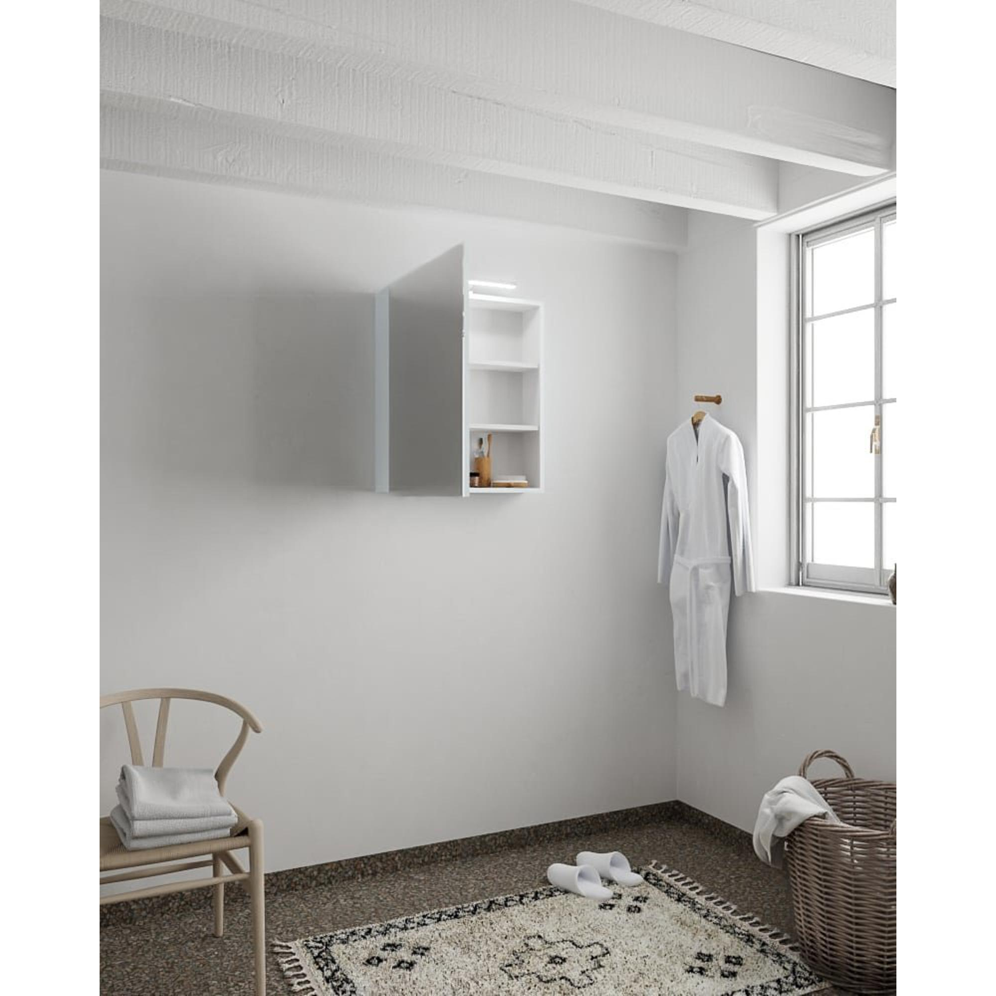 L’armoire est fabriquée en MDF, un matériau largement utilisé et fiable pour les meubles de salle de bains. Il est stable et garantit des façades lisses et régulières dont vous profiterez pendant de nombreuses années. Le miroir à l’avant se nettoie facilement avec un chiffon doux et un nettoyant pour vitres, afin que vous profitiez chaque jour d’une image nette. Comme ce modèle ne dispose pas d’éclairage intégré ni d’élément chauffant, l’installation est simple et vous restez libre de choisir votre propre éclairage de salle de bains, par exemple avec des appliques au-dessus ou à côté de l’armoire de toilette.