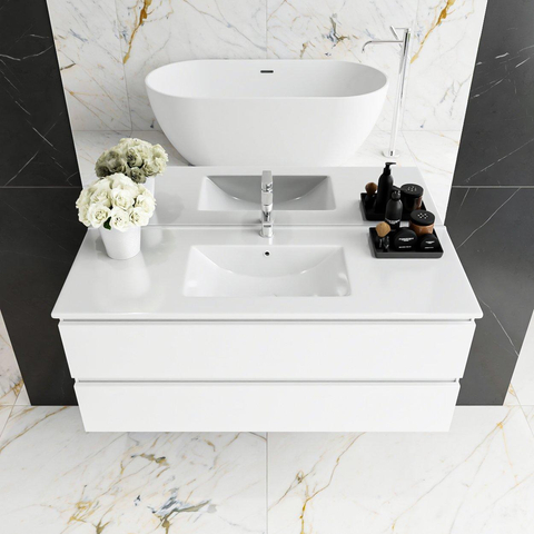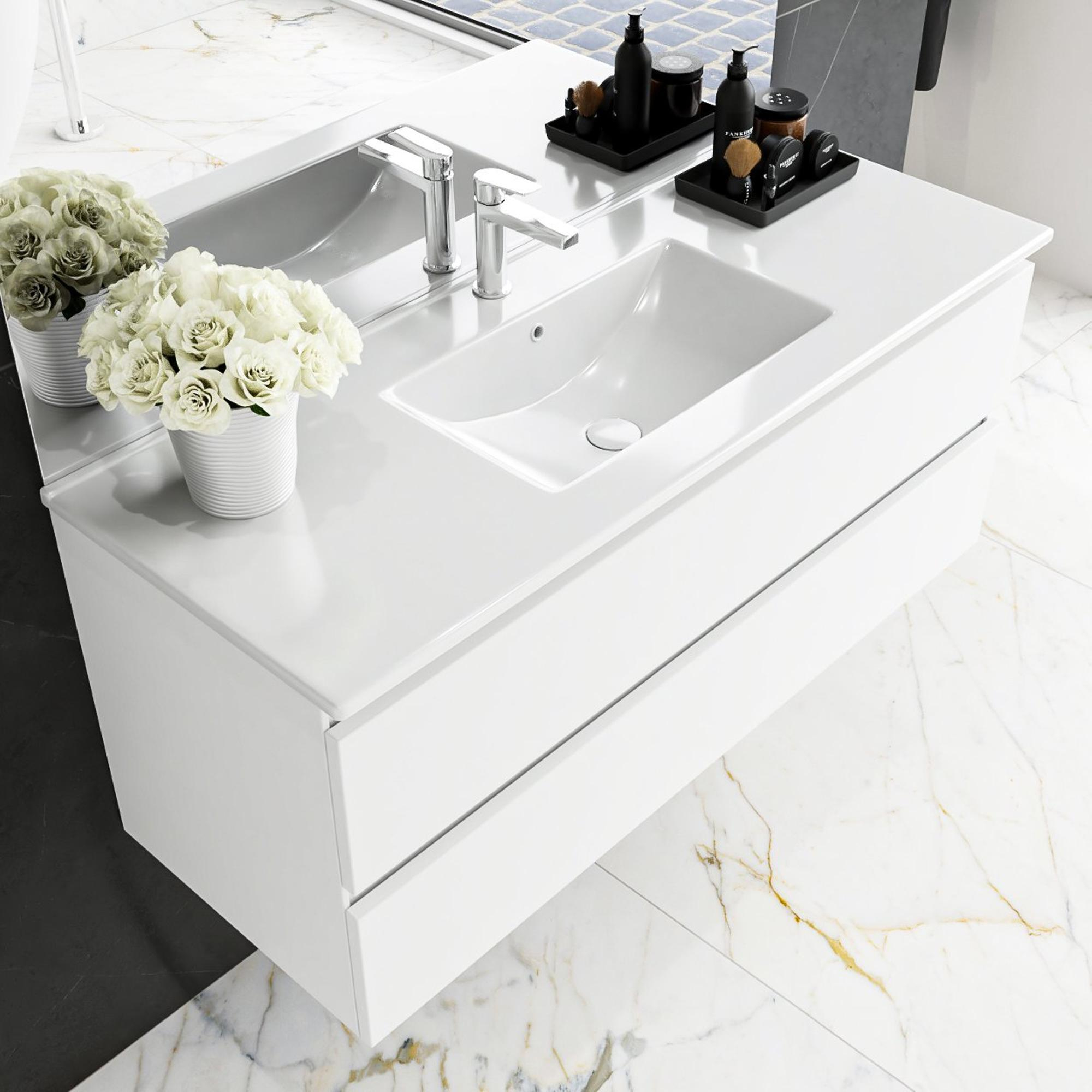 MONDIAZ DENTA Ensemble de meuble - 100cm - 2 tiroirs - lavabo au centre - 1 trou de robinet - Acrylique talc