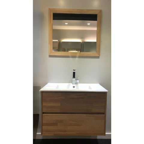 - Ensemble complet avec meuble sous-vasque, plan vasque en céramique et miroir mural assorti en finition bois naturel.