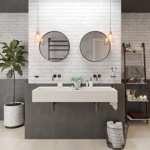 La version sans trous de robinet vous donne une liberté maximale dans le choix du mitigeur de lavabo approprié. Combinez par exemple ce lavabo avec un mitigeur surélevé installé sur le plan à côté ou avec un mitigeur mural au-dessus de la cuve pour une ambiance luxueuse d’hôtel. Grâce à la largeur généreuse de 120 cm et à la profondeur de 45 cm, ce modèle s’adapte parfaitement sur un meuble de salle de bains moderne, mais comme lavabo suspendu mural, le design est également mis en valeur de façon remarquable. La couleur blanche mate se marie sans effort avec des accents noirs, du chrome, du laiton brossé ou d’autres finitions de robinetterie tendance. Que vous souhaitiez une salle de bains sobre en ton sur ton ou au contraire un contraste fort, ce lavabo constitue une base polyvalente pour votre style personnel.
