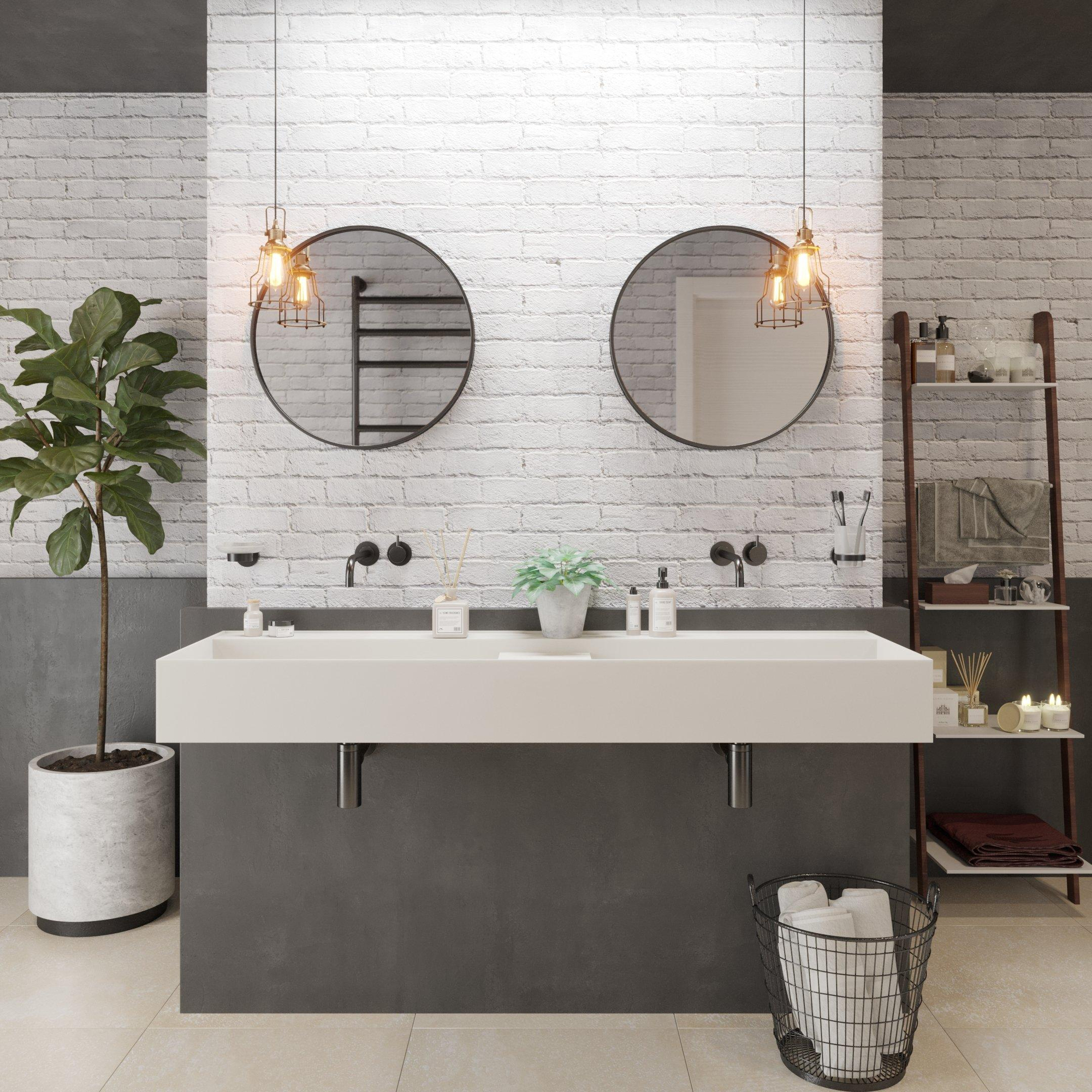 Si vous recherchez un lavabo spacieux et moderne qui donne immédiatement à votre salle de bains une allure apaisante et luxueuse, cette solution murale épurée est un excellent choix. Grâce à ses grandes dimensions, il y a suffisamment de place pour que deux personnes effectuent en même temps leur routine du matin ou du soir, tout en conservant une belle surface continue. La surface blanche mate s’intègre parfaitement dans les salles de bains minimalistes, scandinaves ou design et se marie aisément aussi bien avec le bois clair qu’avec les carreaux foncés. Comme ce modèle est livré sans trous de robinet, vous avez toute liberté de choisir des robinets muraux ou des mitigeurs sur gorge à côté de la cuve, idéal si vous visez un look uniforme et haut de gamme. La zone de dépose intégrée offre un espace pratique pour les essentiels du quotidien, ce qui permet de garder votre plan de travail propre et ordonné. En résumé : une solution intelligente et élégante pour ceux qui souhaitent réunir confort, design et facilité d’utilisation dans une ligne épurée.