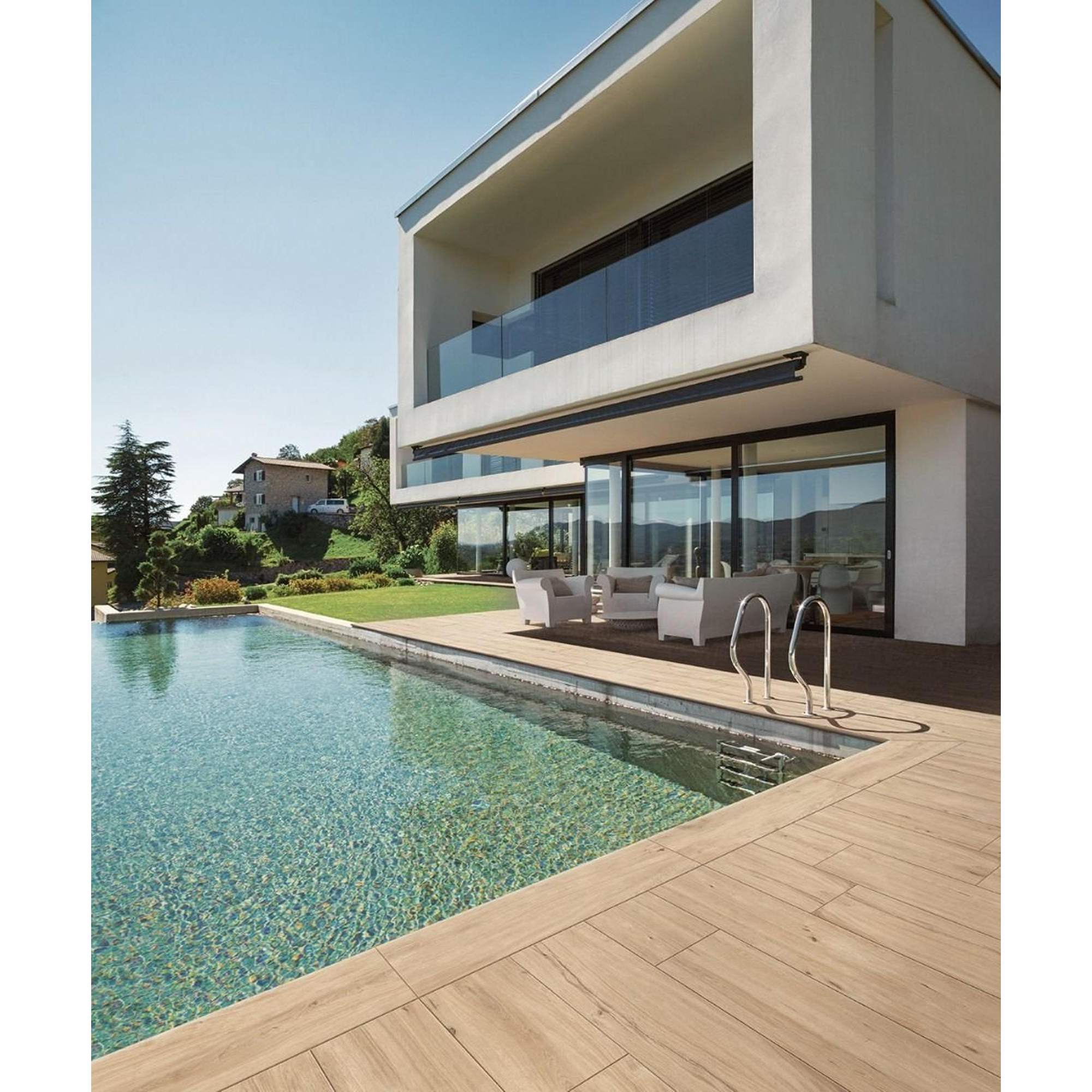 La structure naturelle du bois et la couleur beige mate donnent à votre terrasse la chaleur du vrai bois, sans les inconvénients du grisonnement, des échardes ou de l’entretien périodique. Le format allongé de 30x120 cm renforce l’effet lame, donnant ainsi à votre jardin une impression de longueur et d’espace. Le veinage discret se marie sans effort aussi bien avec les jardins riches en verdure qu’avec les espaces extérieurs minimalistes comportant beaucoup de béton ou d’acier. Vous créez ainsi une base harmonieuse que vous complétez facilement avec des meubles de jardin, des pots et des accessoires dans différents styles. Comme le carreau est rectifié, vous pouvez opter pour des joints étroits pour un ensemble épuré et calme – idéal si vous souhaitez prolonger un sol luxueux et continu de l’intérieur vers l’extérieur avec des carreaux céramiques dans le même style.