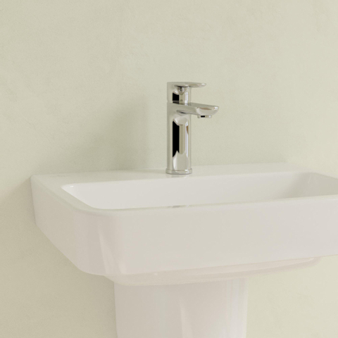 La combinaison de lignes nettes et d’angles doucement arrondis crée une apparence moderne mais néanmoins chaleureuse. La couleur blanche éclatante s’harmonise avec presque tous les styles de salle de bains : du minimaliste et moderne au calme et intemporel. Grâce à son design subtil, ce lave-mains constitue une base idéale aussi bien pour des combinaisons de toilettes calmes et lumineuses que pour des accents marqués avec des carreaux foncés ou un miroir remarquable. L’orifice de trop-plein intégré et le trou de robinet monotrou sont harmonieusement intégrés dans l’ensemble, de sorte que l’aspect reste épuré et soigné, même dans un petit espace où chaque détail compte.