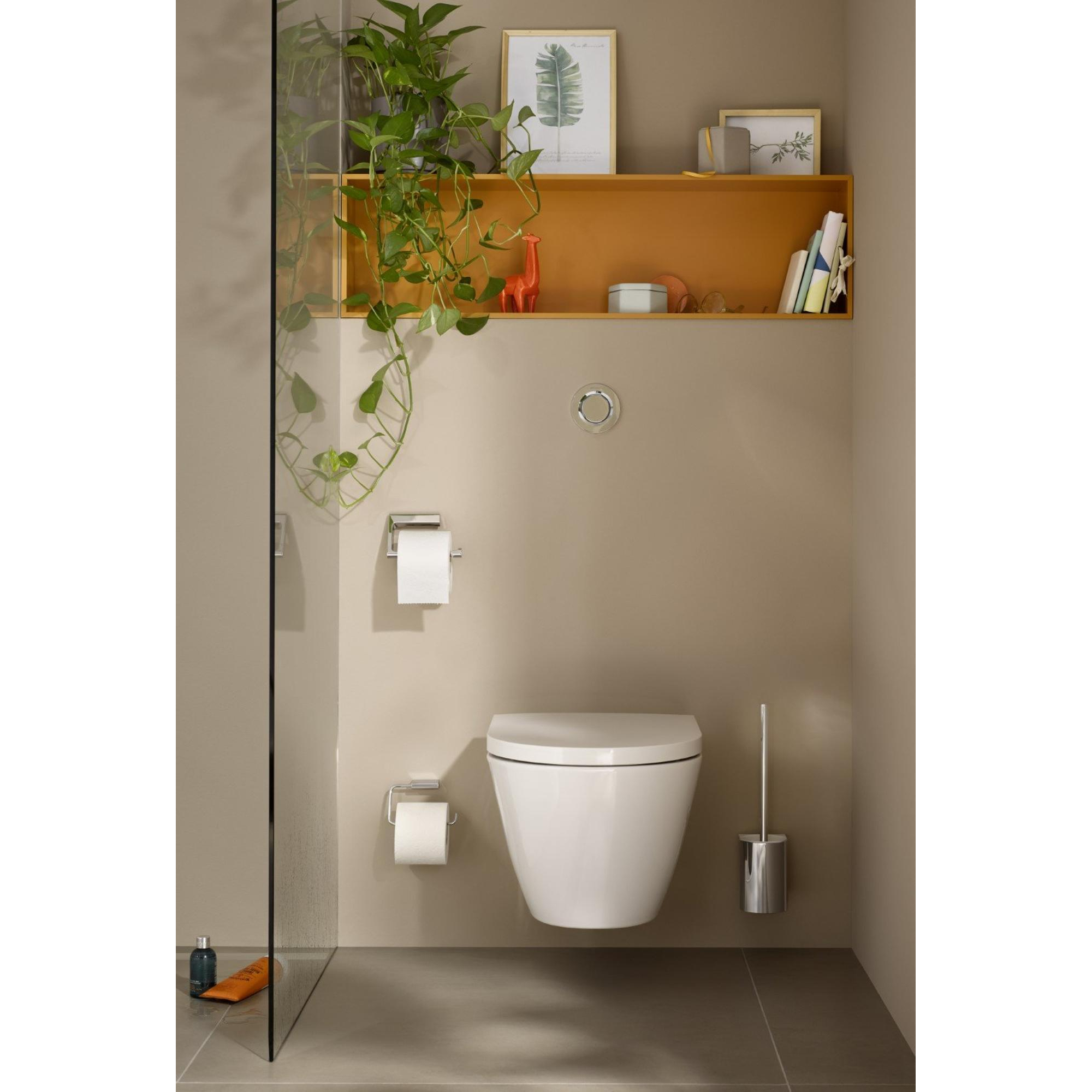 Les lignes claires et la forme ouverte offrent un aspect mural calme et moderne. En l’absence de clapet, le support paraît aérien et l’accent reste mis sur l’ensemble des toilettes plutôt que sur les accessoires individuels. La couche de chrome brillante agit comme un discret accroche-regard qui se marie bien avec d’autres détails chromés, comme le robinet de lave-mains ou la plaque de commande. Vous créez ainsi facilement un ensemble harmonieux, même si vous ne remplacez que vos accessoires. Cela rend le produit idéal pour ceux qui souhaitent obtenir une apparence haut de gamme et axée sur le design avec de petits ajustements.