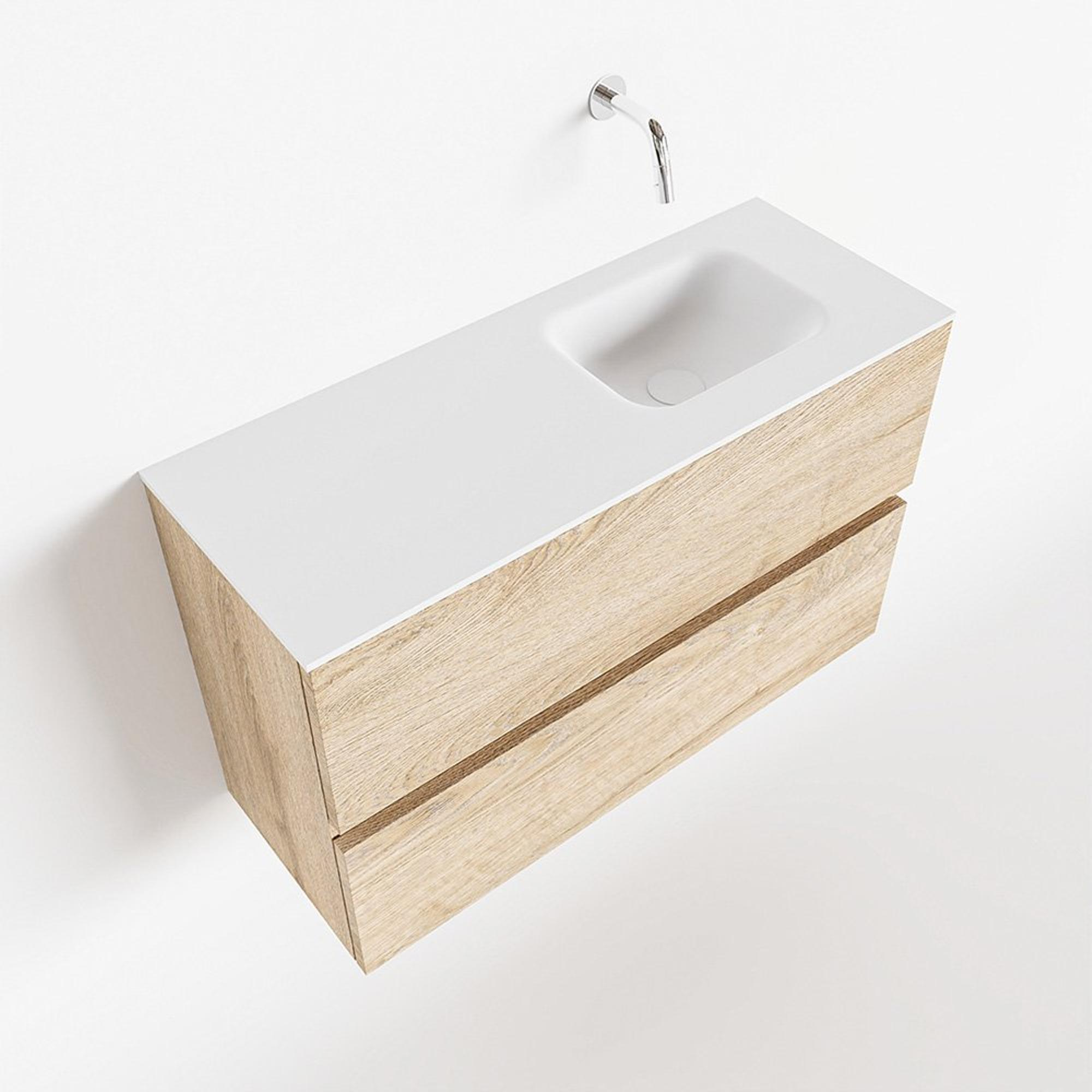 MONDIAZ ADA Meuble WC - 80x30x50cm - 0 trous de robinet - 2 tiroirs - chêne blanchi mat - lavabo à droite - Solid surface - Blanc