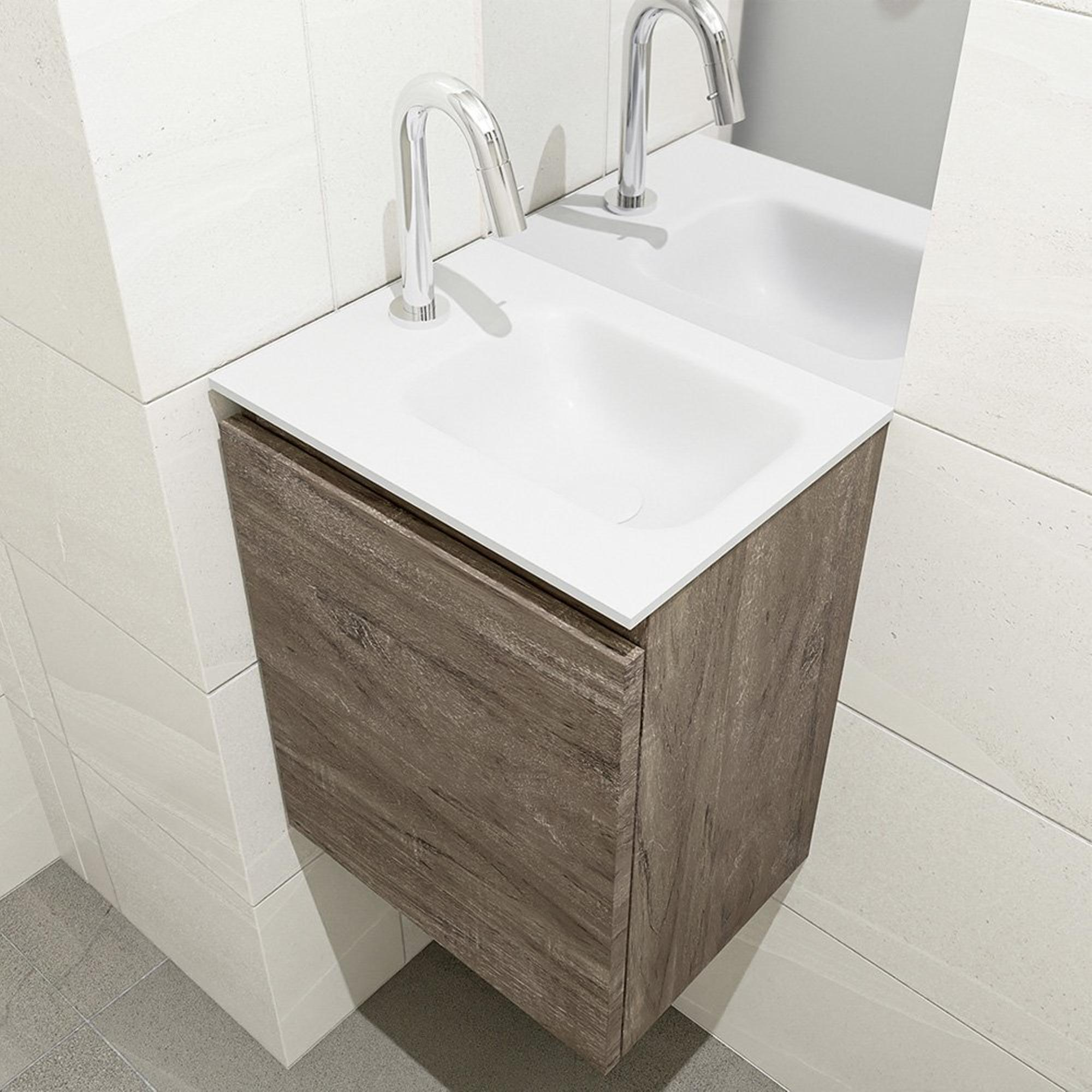 MONDIAZ OLAN Kit lave-mains - 40x30x40cm - 1 trou de robinet - 1 tiroir - marron foncé mat - lavabo à droite - Solid Surface Blanc