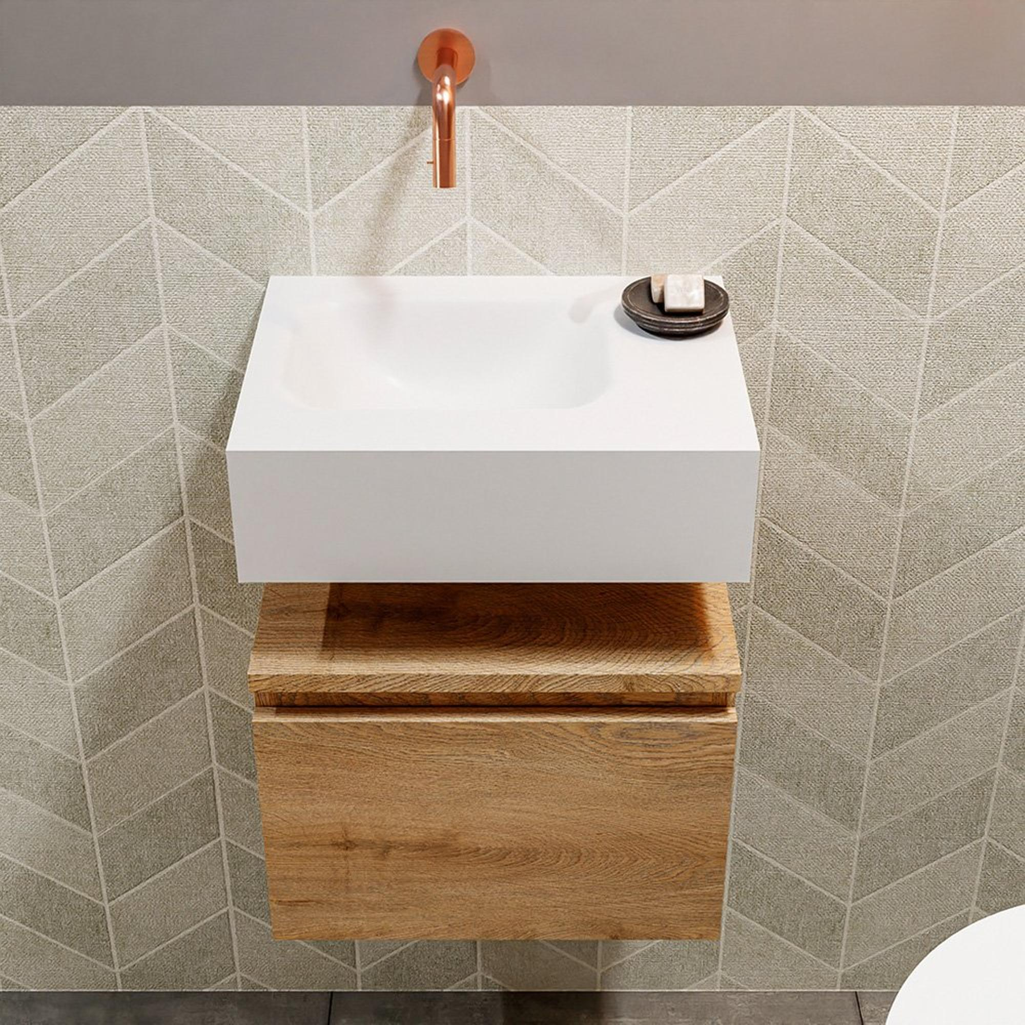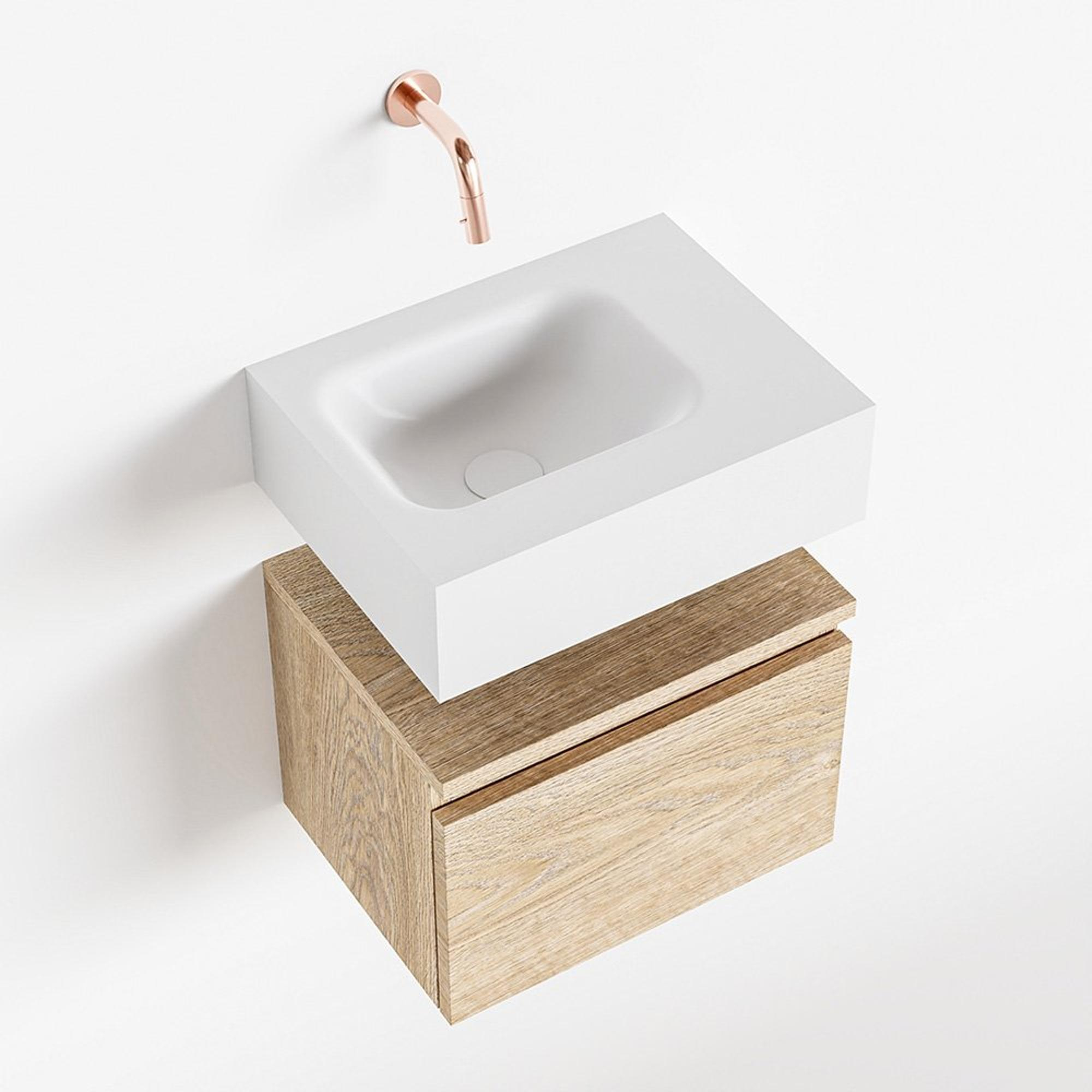 MONDIAZ ANDOR Meuble de toilettes - 40x30x30cm - 0 trous de robinet - 1 tiroirs - chêne lavé mat - vasque gauche - Solid surface - Blanc