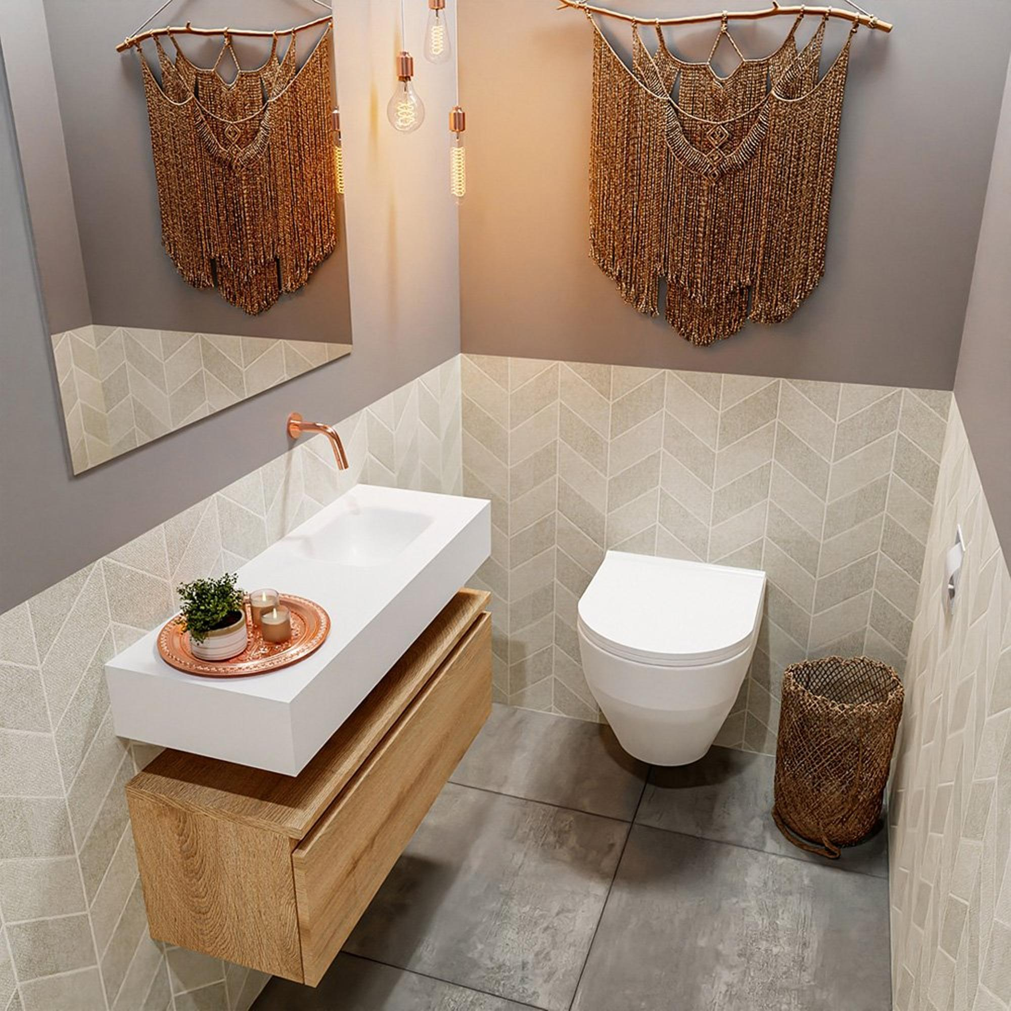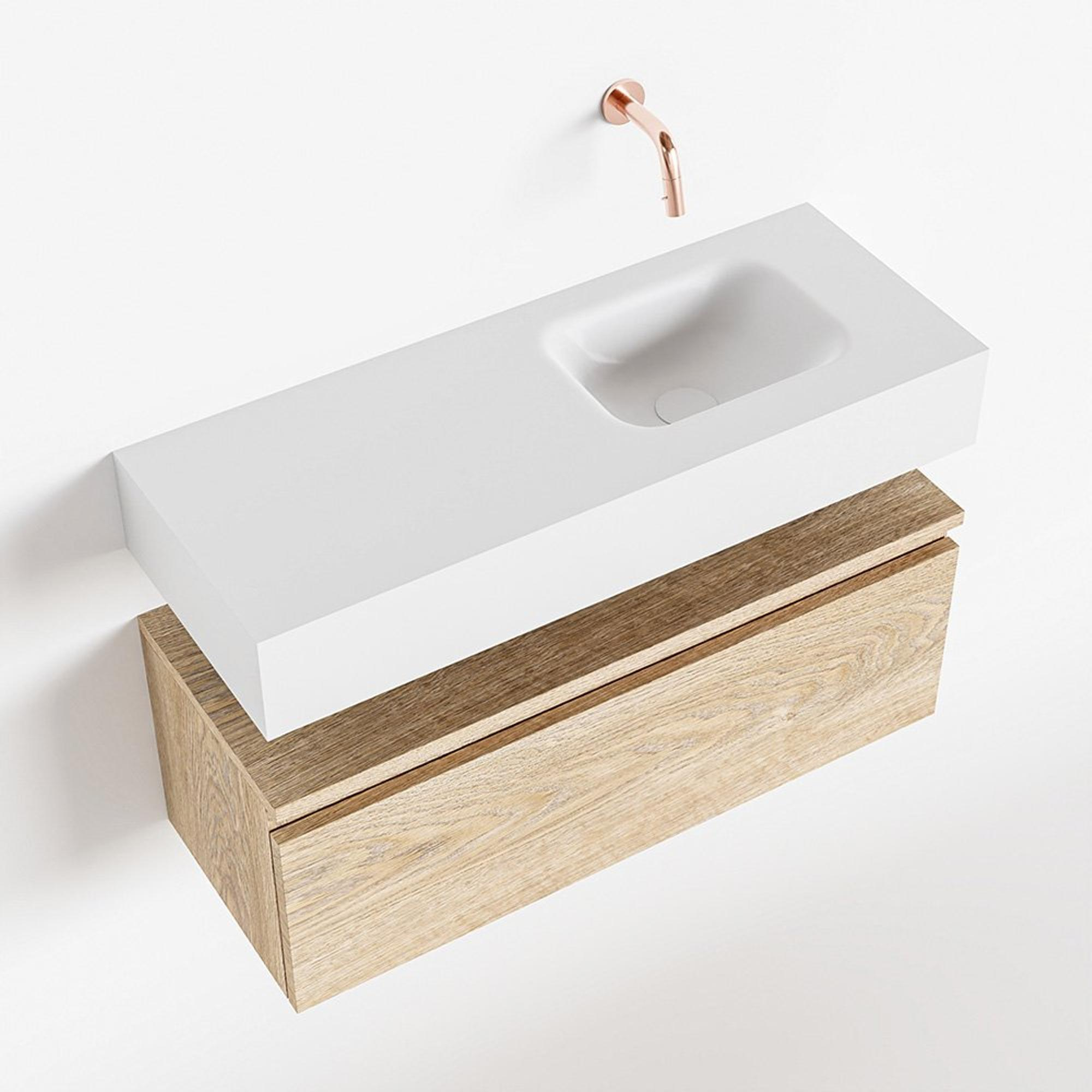 MONDIAZ ANDOR Meuble WC - 80x30x30cm - 0 trous de robinet - 1 tiroirs - chêne blanchi mat - vasque à droite - Solid surface - Blanc