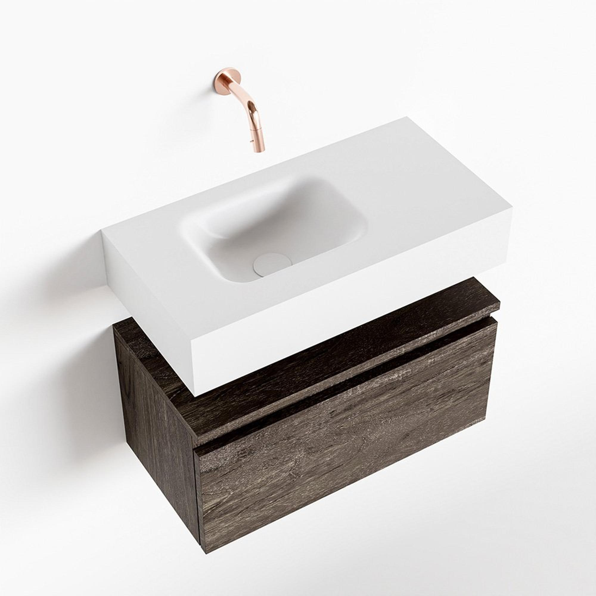 MONDIAZ ANDOR Meuble WC - 60x30x30cm - 0 trous de robinet - 1 tiroir - brun foncé mat - vasque à gauche - Solid surface - Blanc