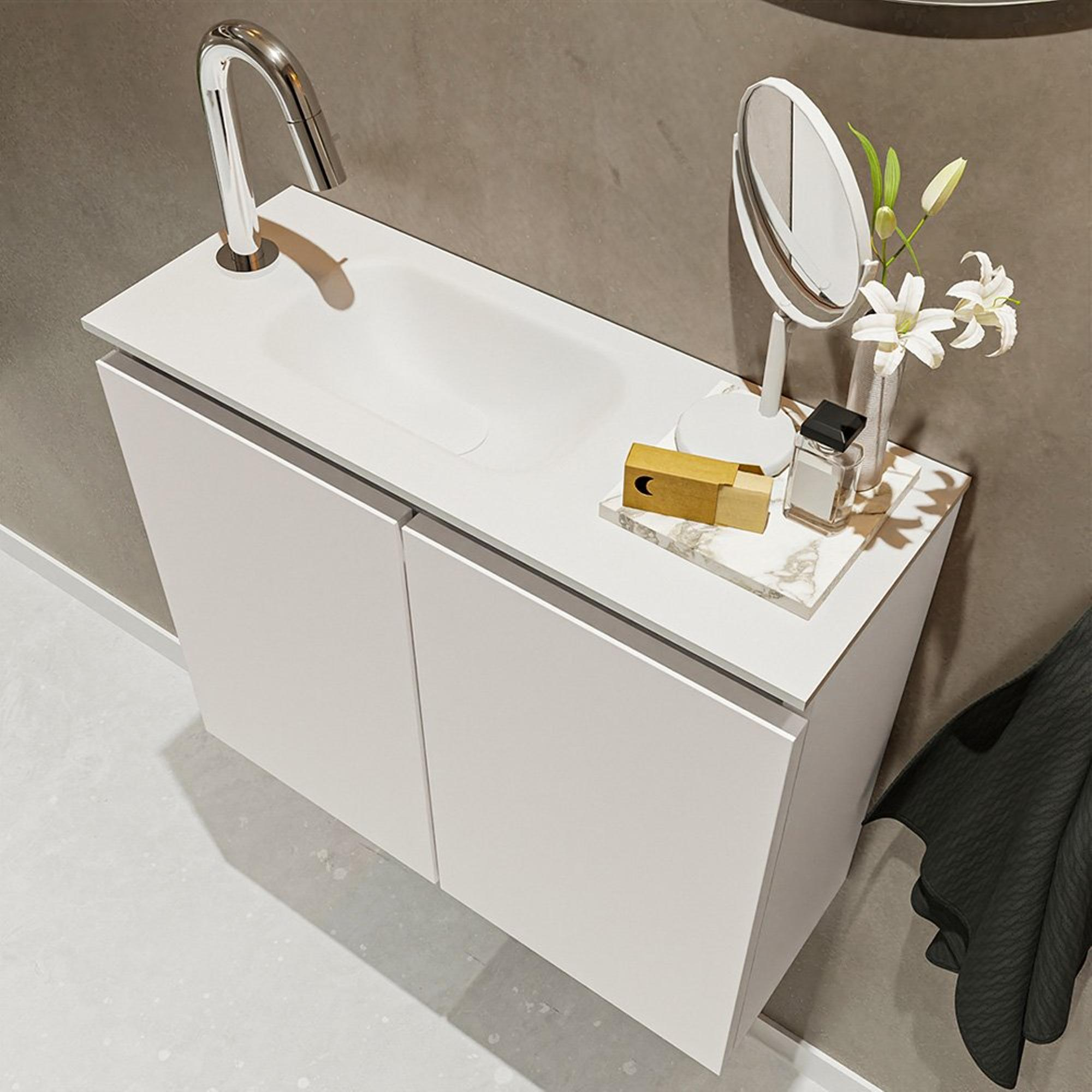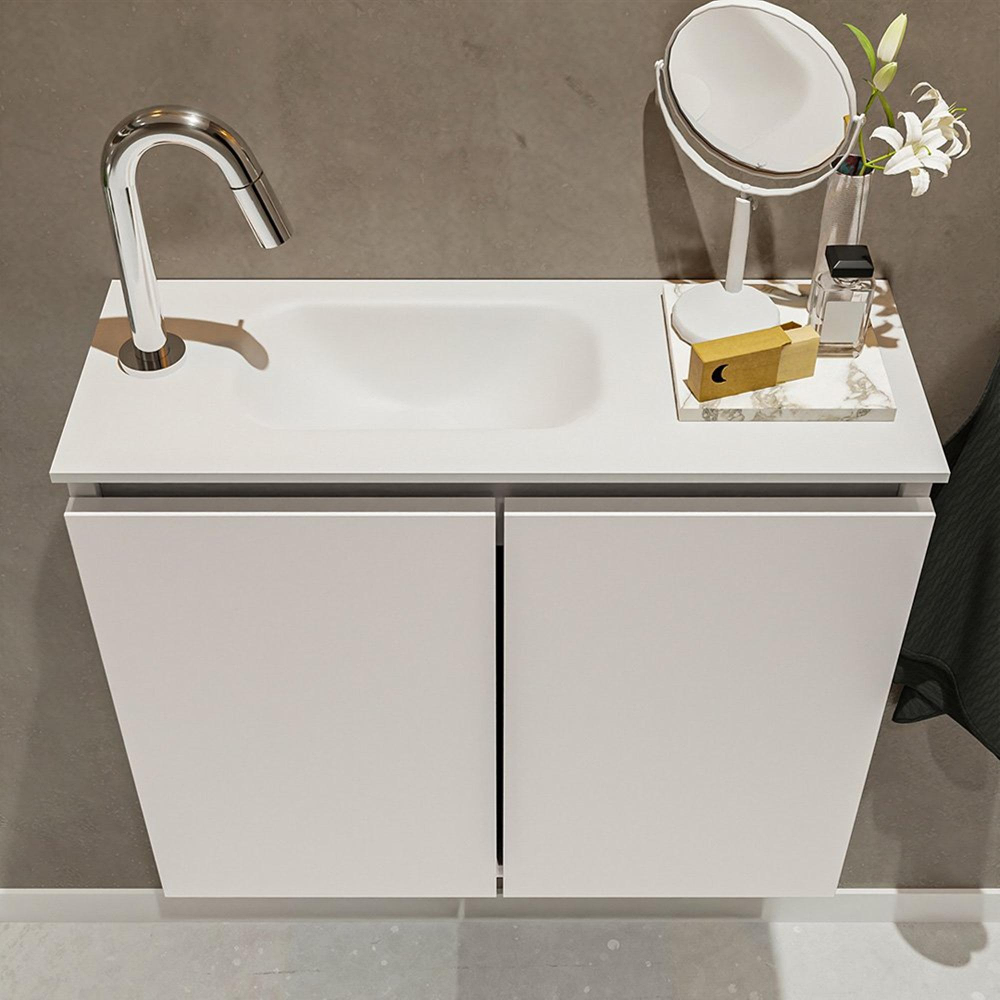 MONDIAZ TURE Kit lave-mains - 60x23x50cm - 1 trou de robinet - 2 portes - lin mat - Lavabo à gauche - Solid Surface Blanc