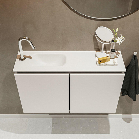 MONDIAZ TURE Kit lave-mains - 80x23x50cm - 1 trou de robinet - 2 portes - lin mat - Lavabo à gauche - Solid Surface Blanc