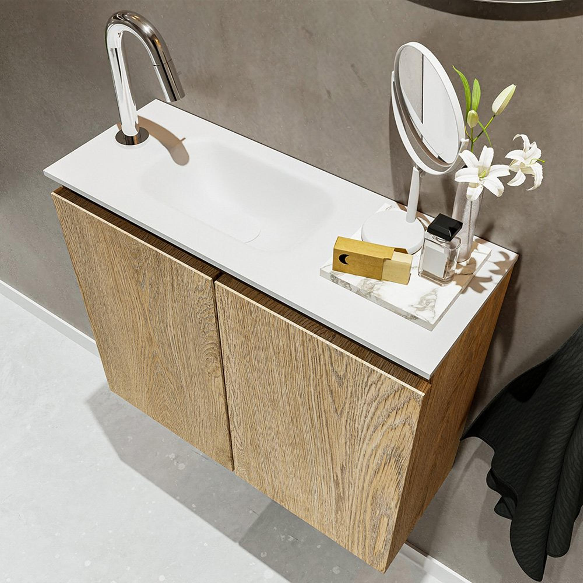 MONDIAZ TURE Kit lave-mains - 60x23x50cm - 1 trou de robinet - 2 portes - chêne blanchi mat - Lavabo à gauche - Solid Surface Blanc