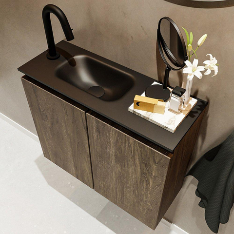 MONDIAZ TURE Kit lave-mains - 60x23x50cm - 1 trou de robinet - 2 portes - marron foncé mat - Lavabo à gauche - Acrylique Noir
